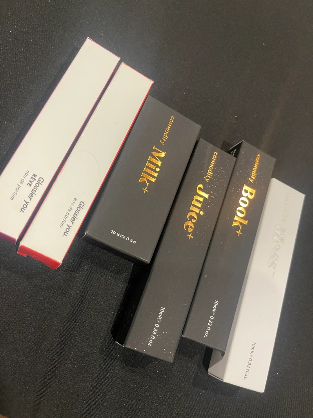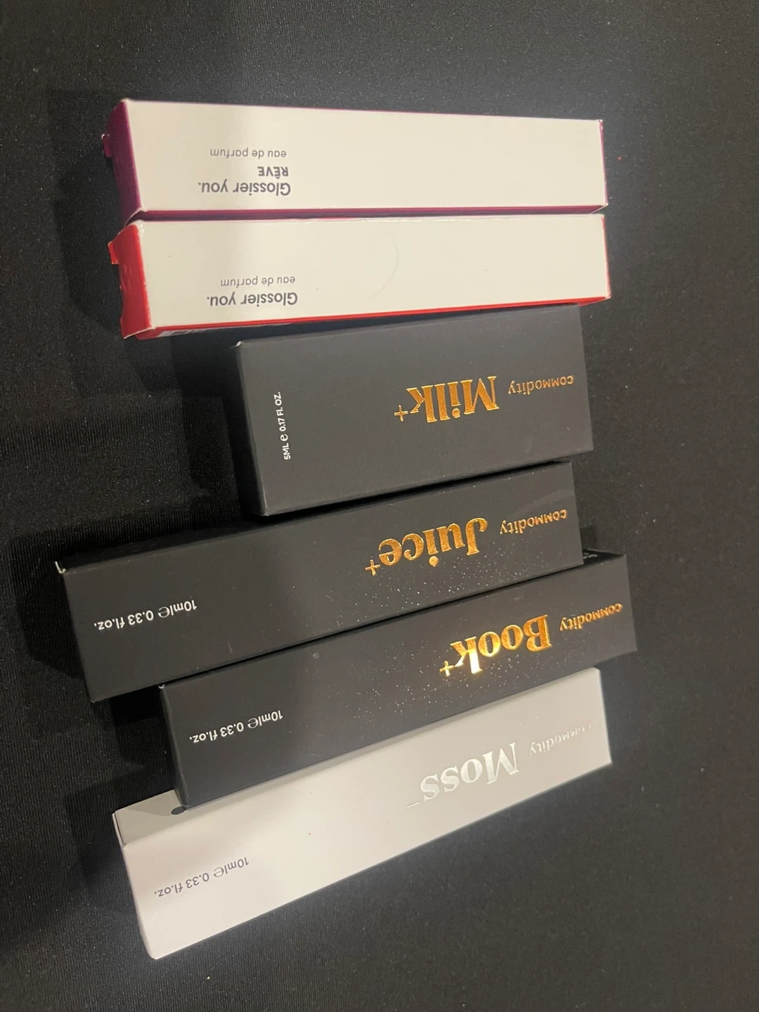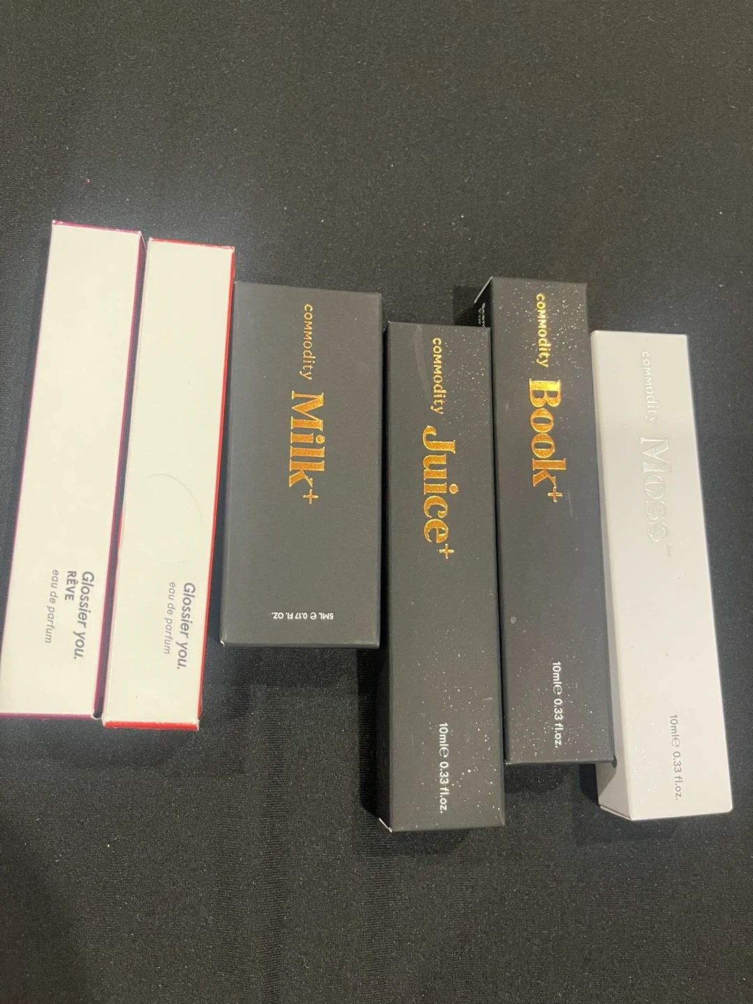 Selling a set of fragrances including Glossier You (original and Rêve eau de parfum 8mls) and the Commodity Discovery Set (Milk+ 5ml, Juice+ 10ml, Book+ 10ml, and Moss- 10ml). Glossier You is a classic, and the Commodity set offers a variety of unique scents to explore! Each fragrance is in its original packaging.