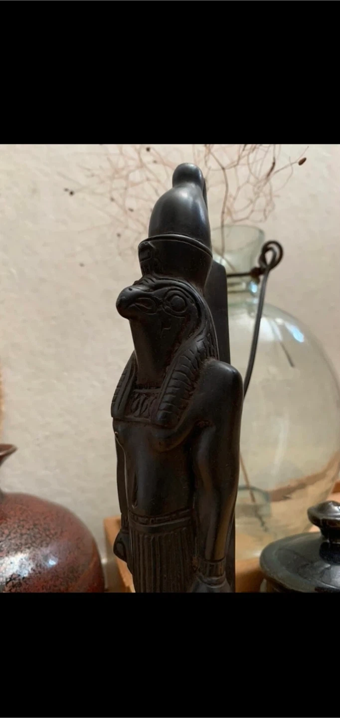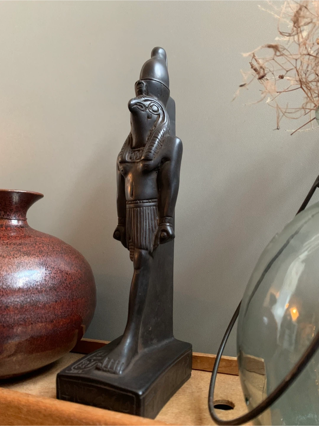 Crafted in solid polystone, this hand-carved figure represents Horus, the revered sky deity whose eyes symbolized the sun and moon.