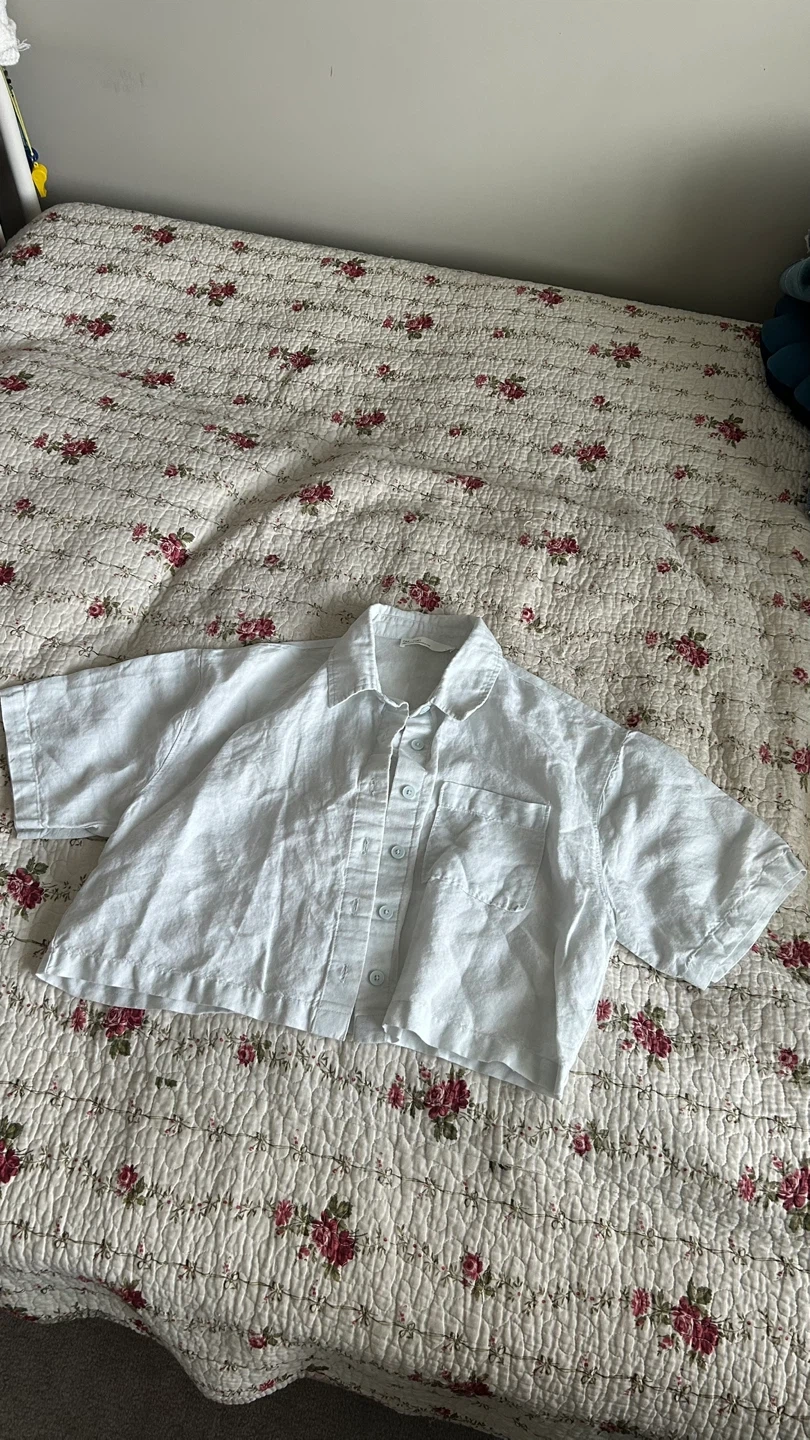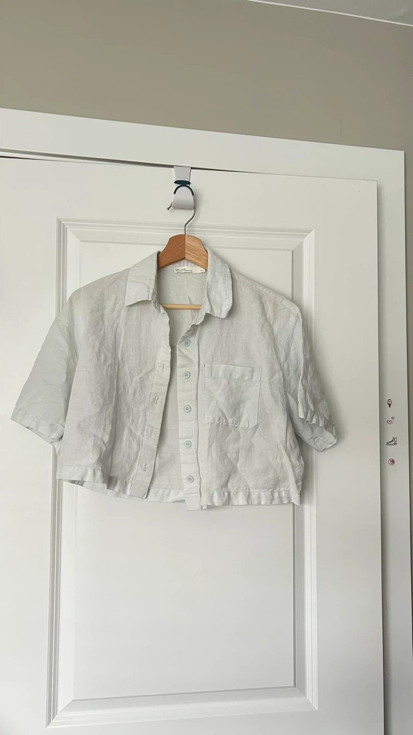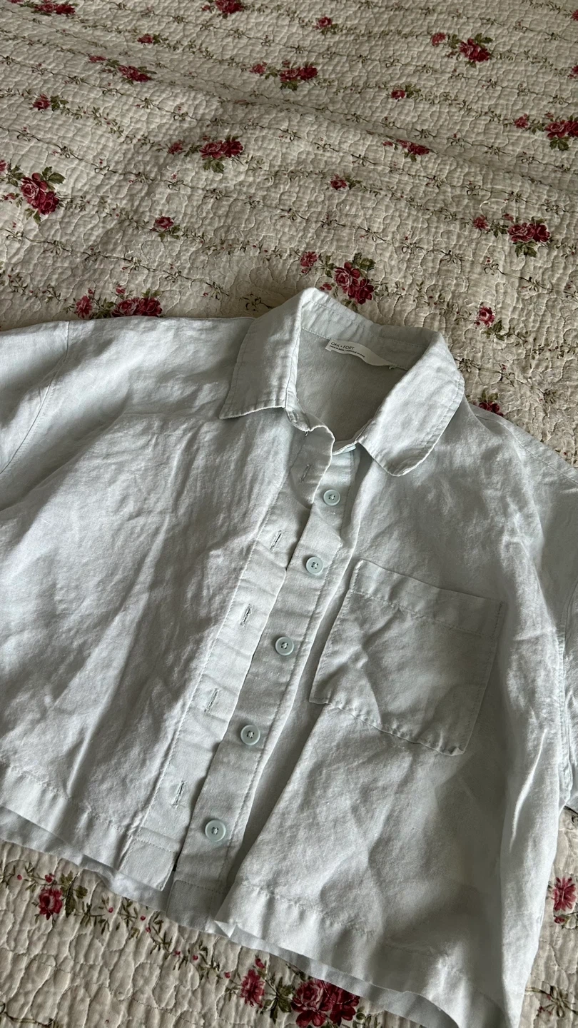 Pale blue Oak and Fort cropped button shirt, size XS.