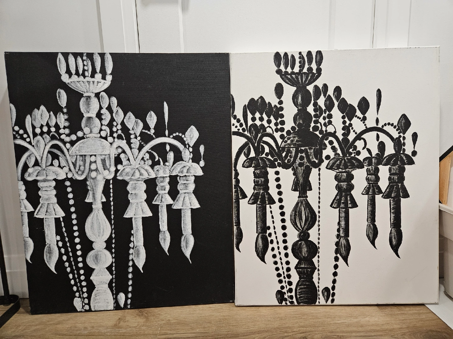 97Selling two chandelier paintings, one in black and one in white. They would make a great addition to your home decor! 24 x30 inch each paint 50 each paint take two for 80$