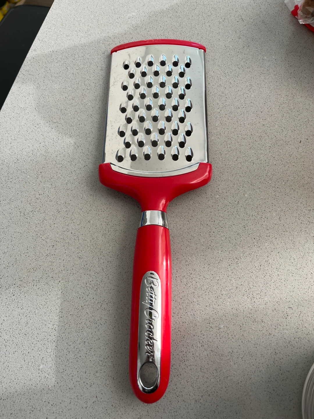 Betty Crocker 4-sided box grater. It's red and has a comfortable handle. Stainless steel grating surfaces.