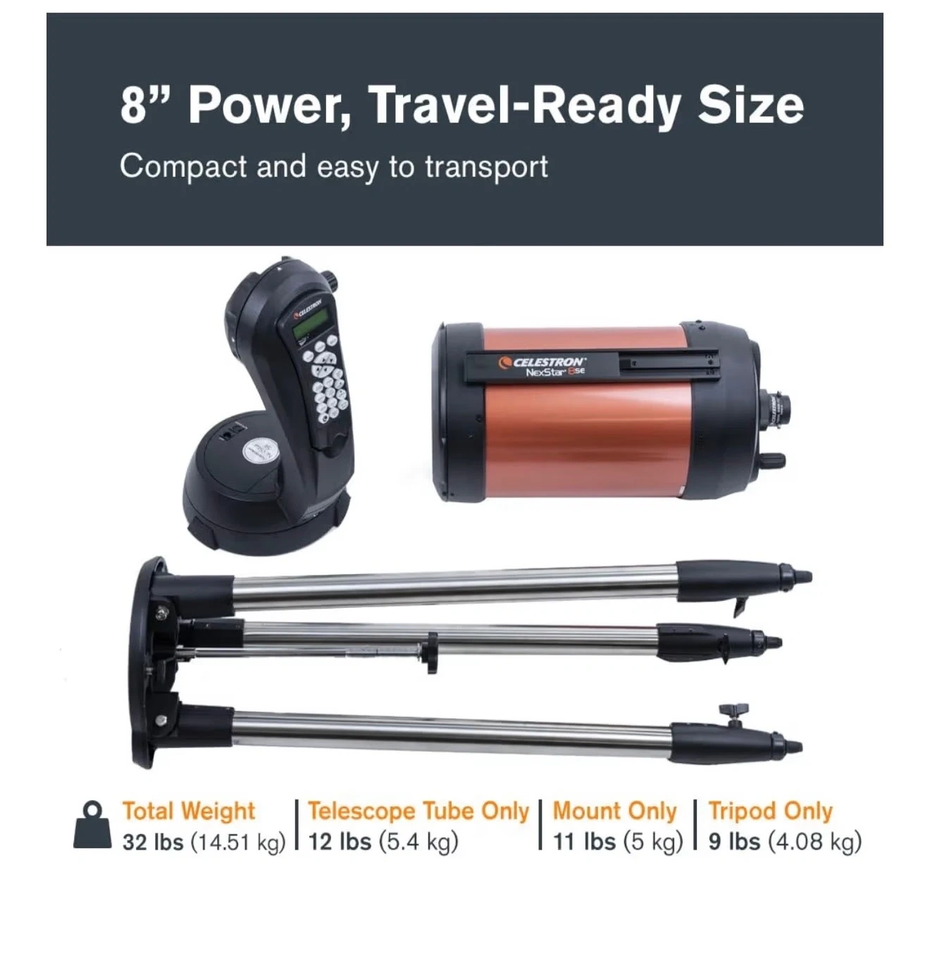 Orange computerized telescope with mount and tripod. Total weight 32 lbs (14.51 kg). Telescope tube only 12 lbs (5.4 kg). Mount only 11 lbs (5 kg). Tripod only 9 lbs (4.08 kg). Includes mount, optical tube, and tripod.this was only used once and has the original packaging.