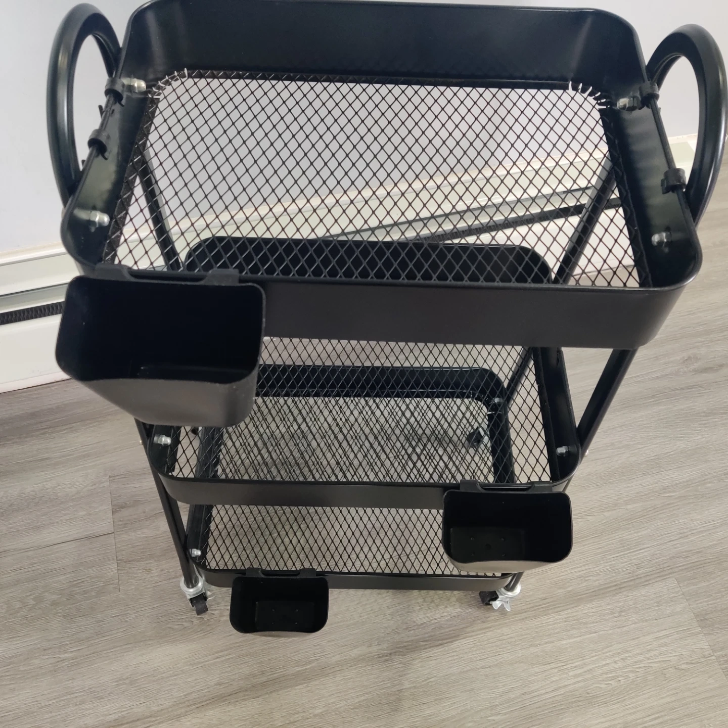 This is a versatile 3-tier rolling storage cart in black. It includes several detachable bins for extra organization. The cart's mesh shelves and wheels make it easy to move around your space. It's great for craft supplies, kitchen items, or bathroom essentials!