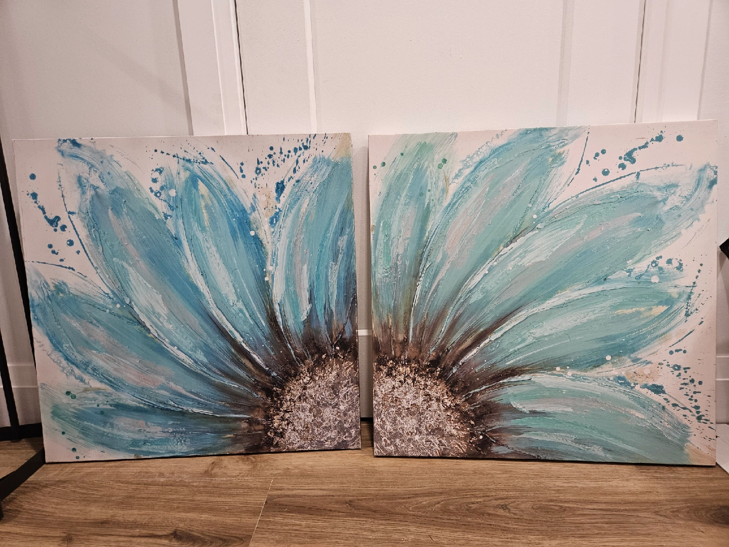 97Selling a set of two canvas wall art pieces featuring a beautiful floral design in shades of blue and brown. They're in great shape and ready to brighten up any room! 24 x24 inch each art