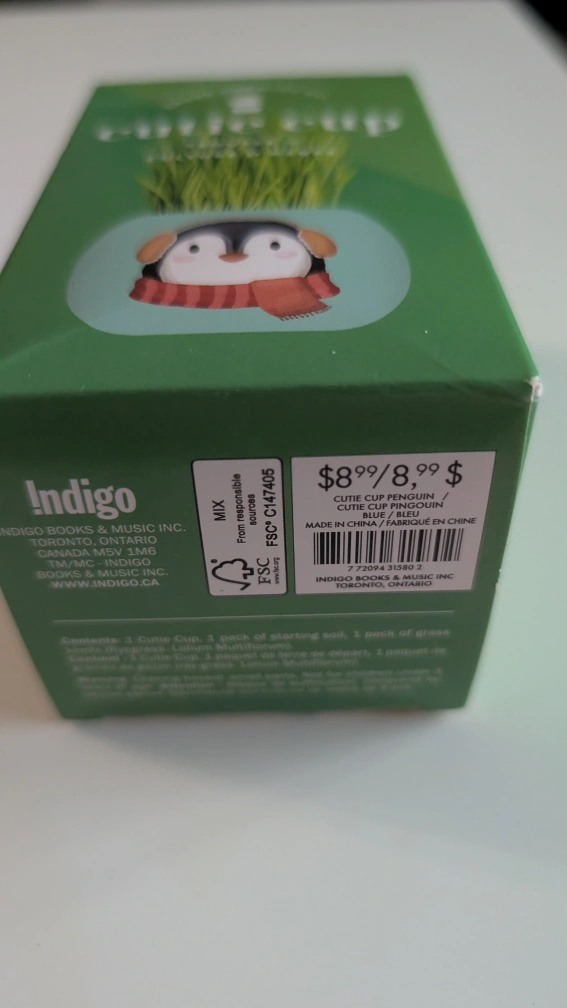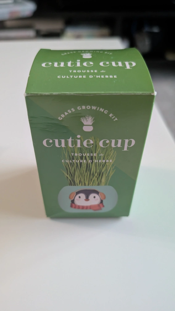 Grow your own little patch of grass with this Cutie Cup kit! It's brand new and comes with everything you need to get started. Just add water and watch it grow in about 7 days. The box includes care instructions in both English and French. This cute penguin design is sure to brighten up any space! Originally $8.99 at Indigo.