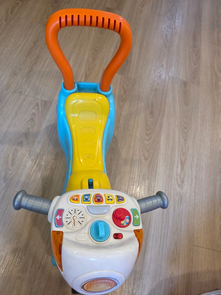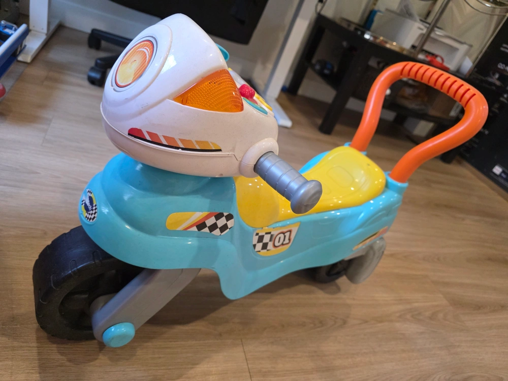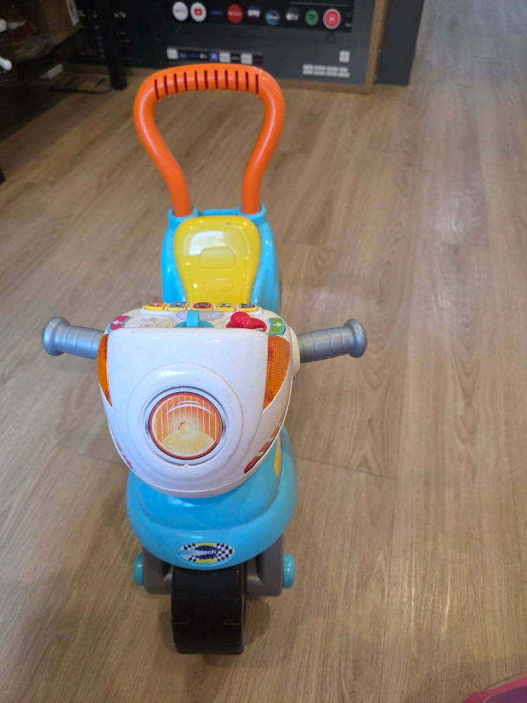 Selling a VTech ride-on motorcycle for little ones! It's in great shape and ready for a new home. Perfect for toddlers learning to balance and explore. It has bright colours and fun details!