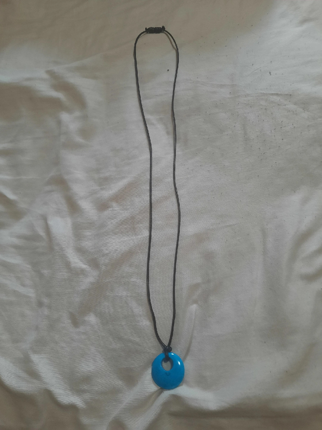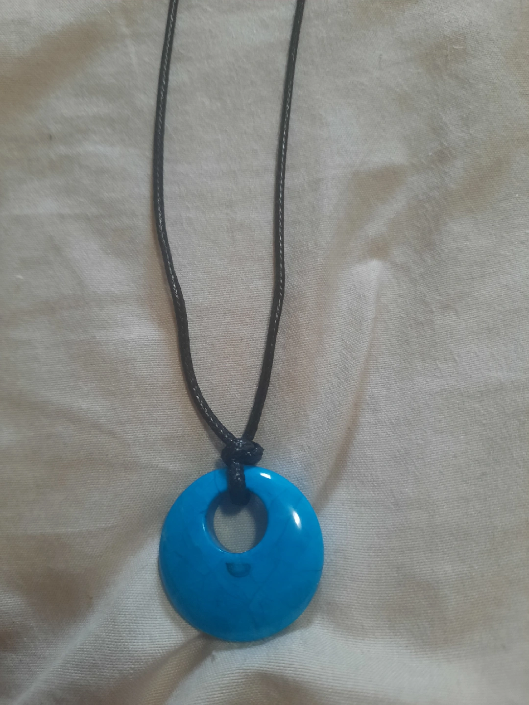 Pendant: The pendant is a round, blue, ring-shaped object, often referred to as a "donut" or "disc" style. It appears to be made of stone, acrylic, or a similar material.
