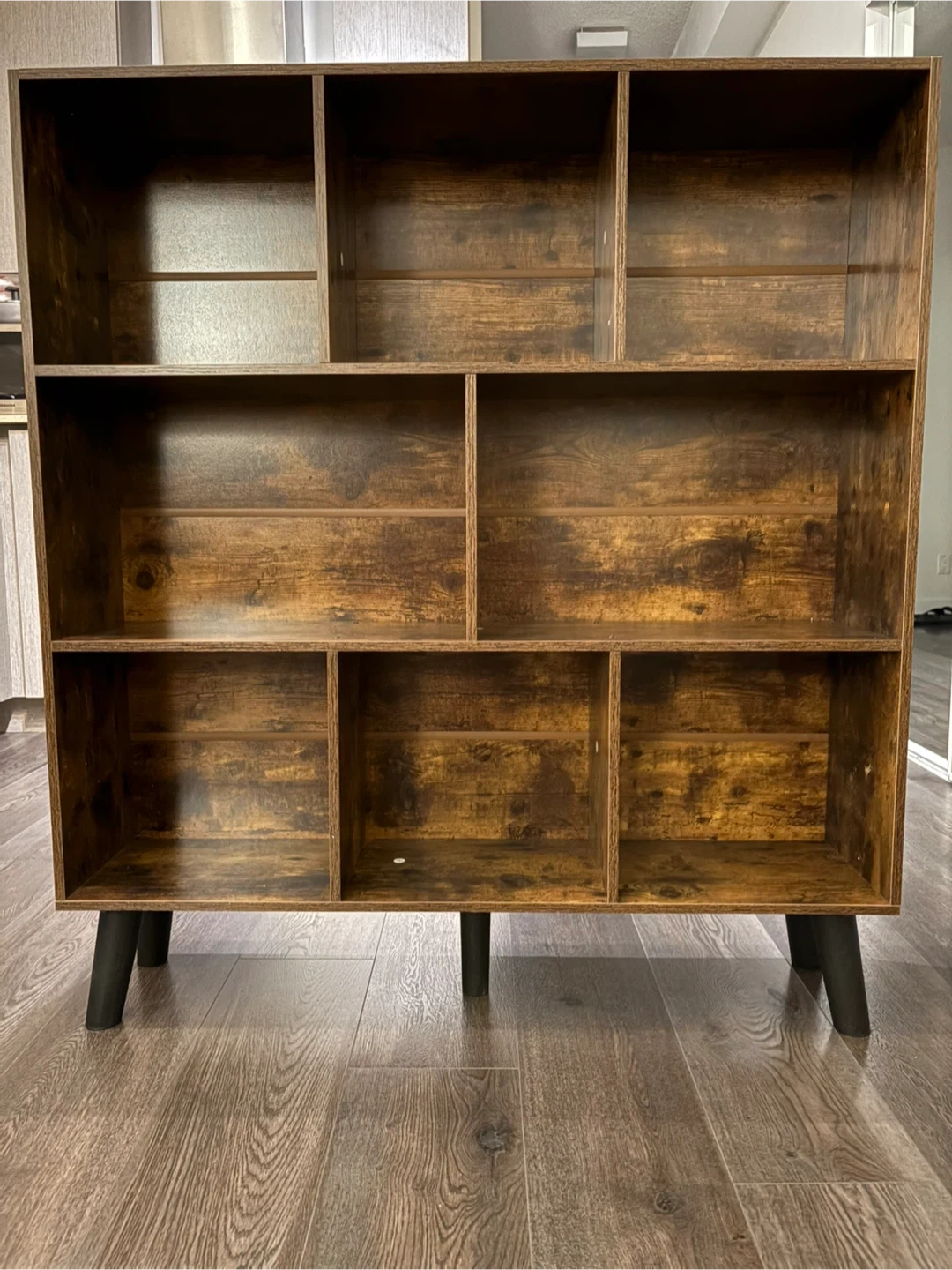 Selling a BRAND NEW rustic brown bookshelf with 8 storage cubes. The dimensions are approximately 39.37 inches wide, 43.30 inches tall, and 9.45 inches deep.