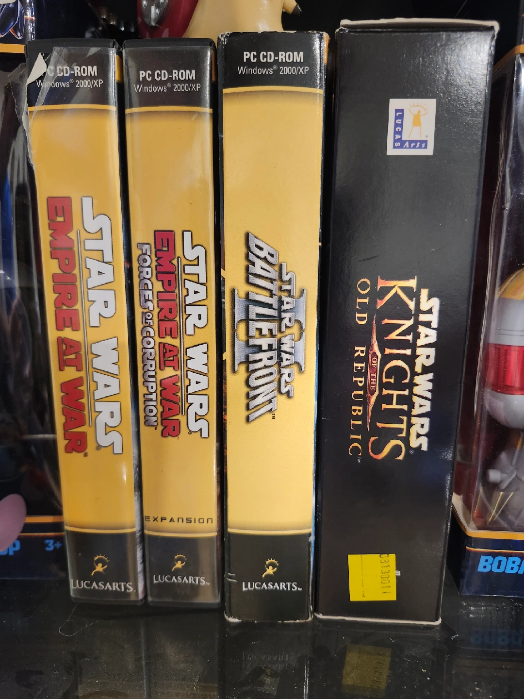 Selling a collection of Star Wars PC CD-ROM games by LucasArts! Includes: - Star Wars Empire at War - Star Wars Empire at War Forces of Corruption Expansion - Star Wars Battlefront 2 ( OG 2005) - Star Wars Knights of the Old Republic Great to add to any Collection. feel free to ask for more pics.