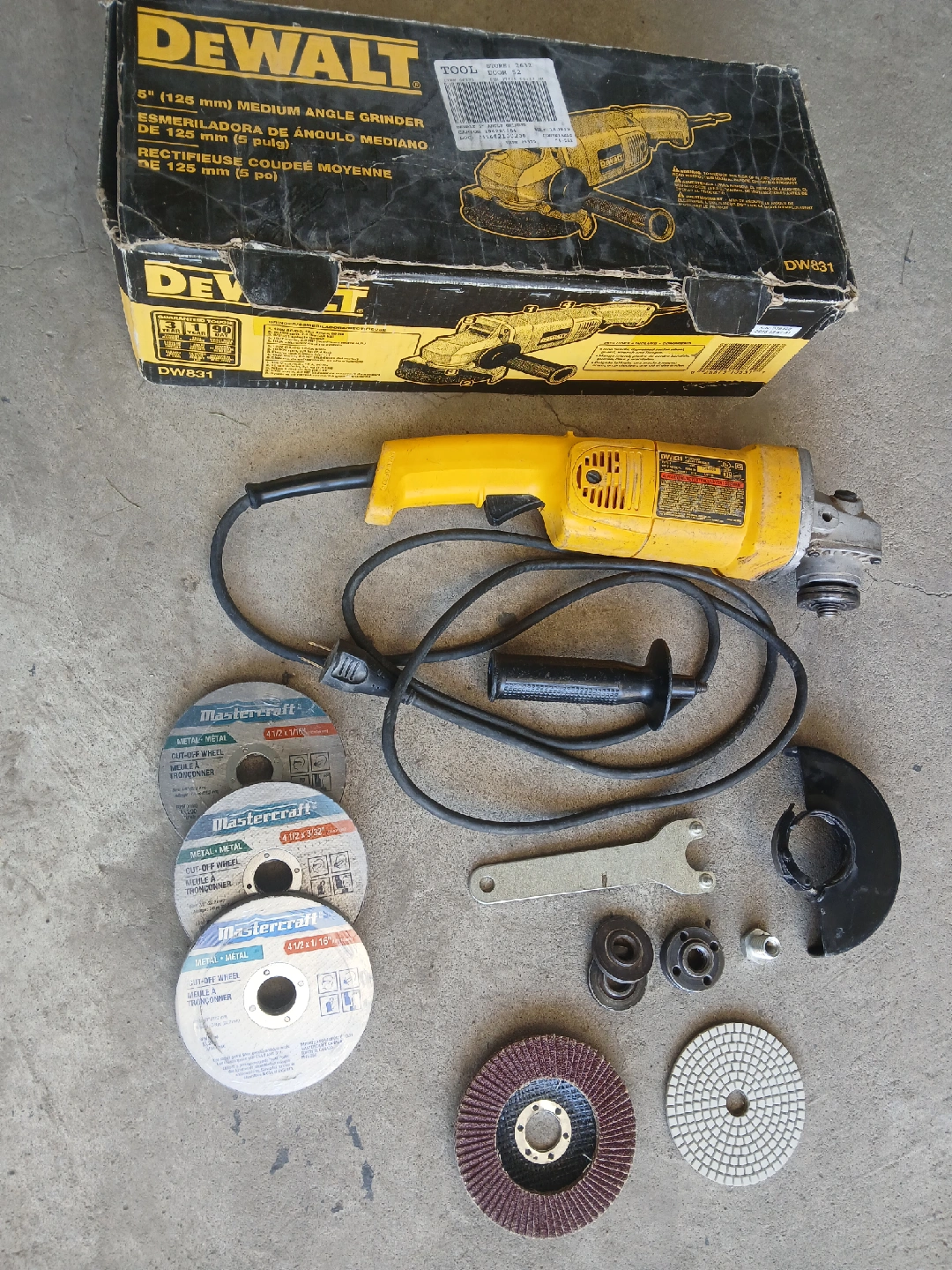 Selling a DeWalt 5" (125 mm) medium angle grinder, model DW831. It comes with a variety of Mastercraft metal cut-off wheels and other accessories. The original box is included!