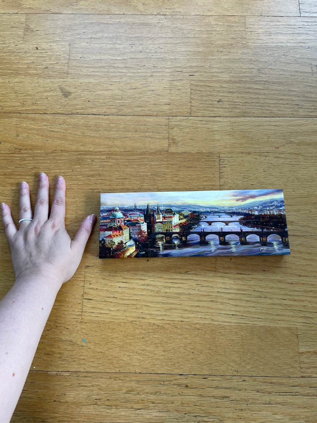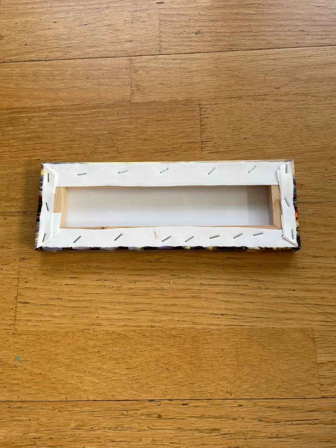 Approximately 11” x 4”. Hand for reference to show its a smaller painting.