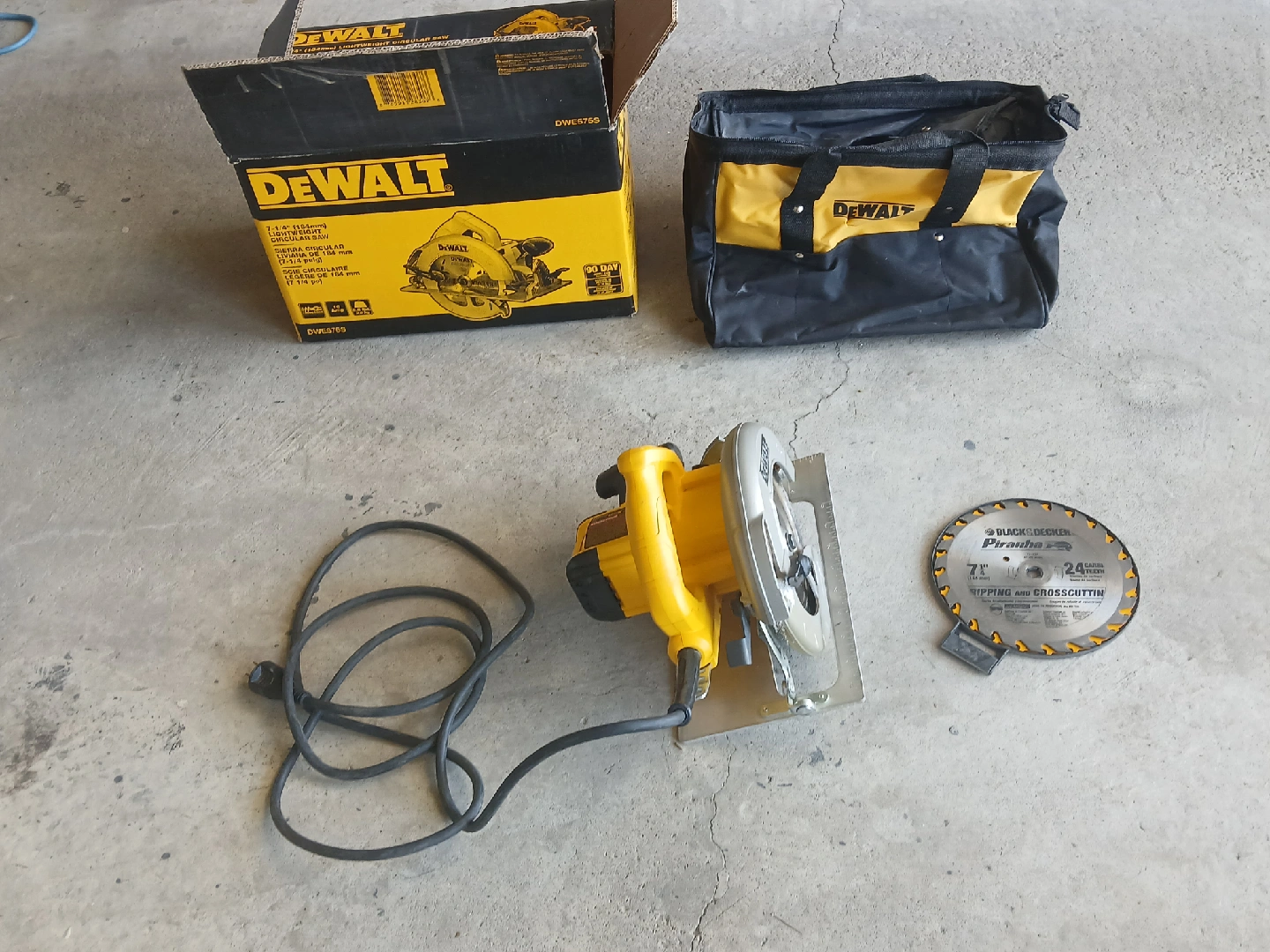 Selling a DeWalt DWE575 7-1/4" circular saw. It comes with its original case! It's in good working condition and ready for your next project. Includes an extra Black & Decker Piranha 7-1/4" 24T blade.