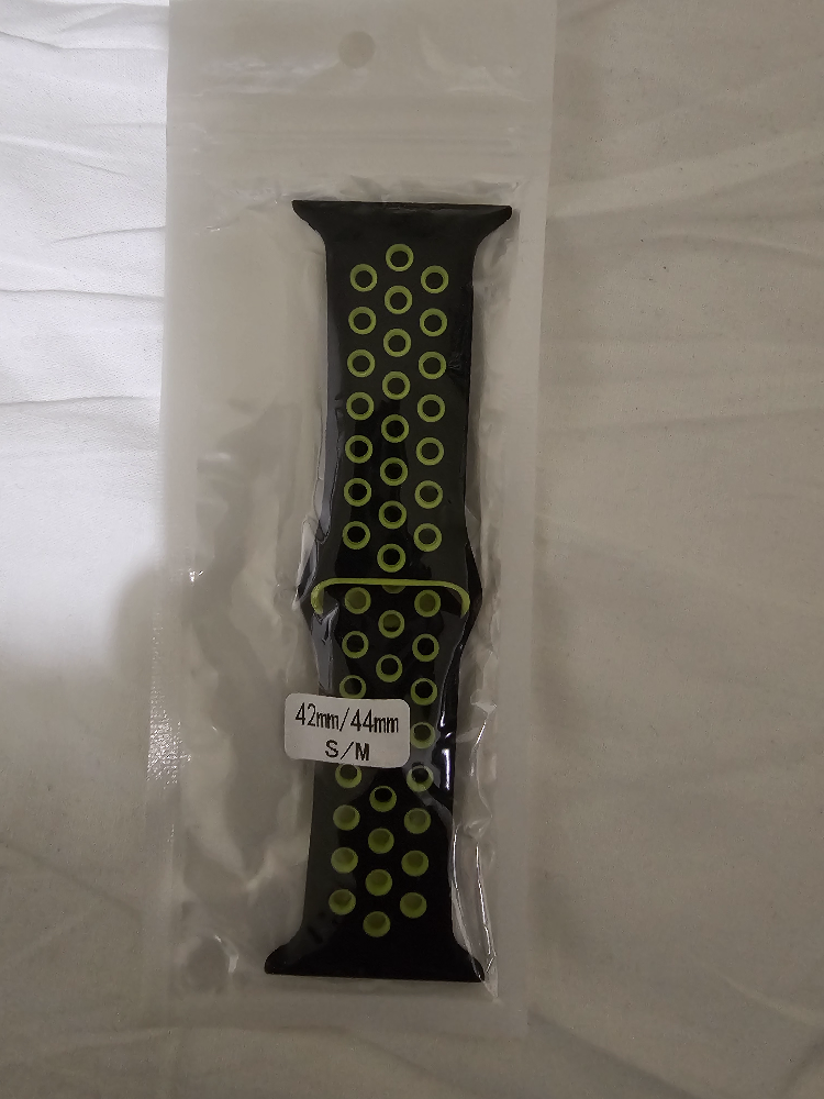 Selling a black and green Apple Watch band. It's compatible with 42mm and 44mm Apple Watches and is size S/M