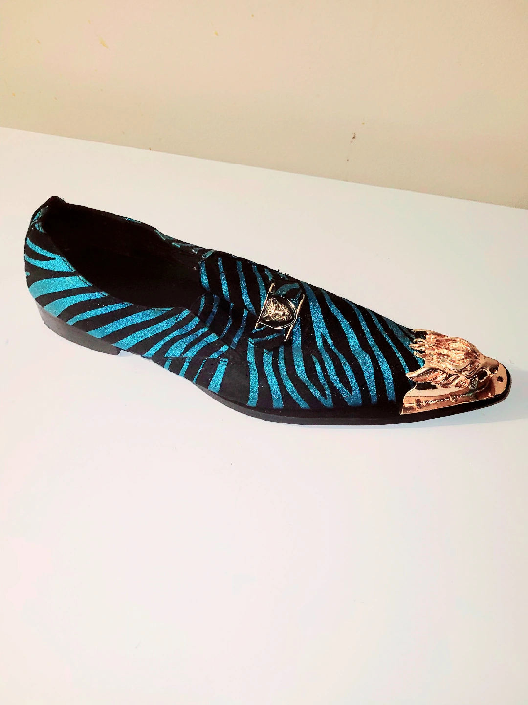 Selling a pair of men's dress shoes with a unique blue and black zebra print design. These shoes feature a gold-tone accent on the toe and a decorative buckle. They are in good condition and ready to add some flair to your wardrobe!