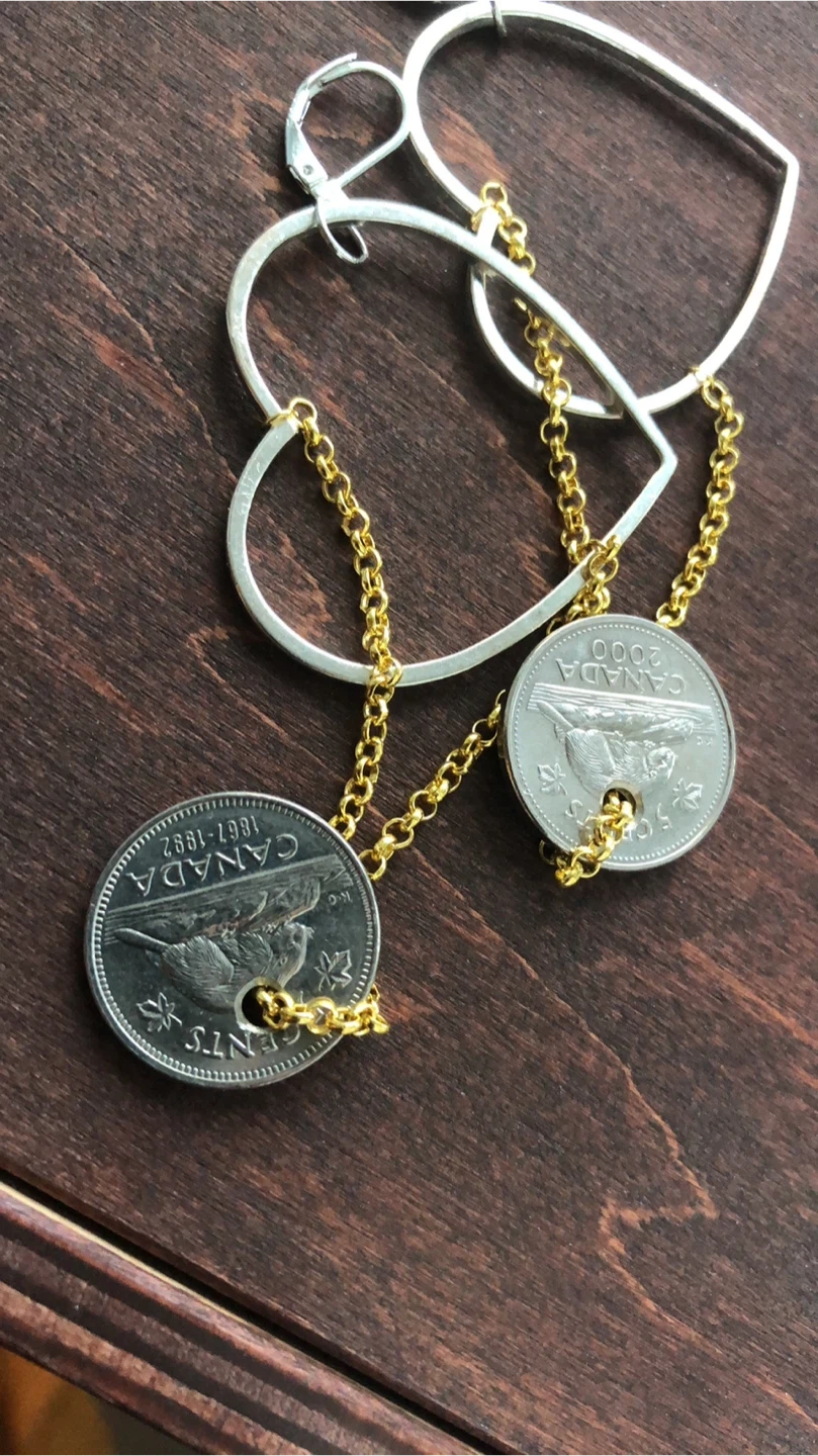 Unique handmade earrings featuring Canadian coins! These dangle earrings have a silver-tone heart shape with gold-tone chains and Canadian coins. The earrings are made of sterling silver Clasp.