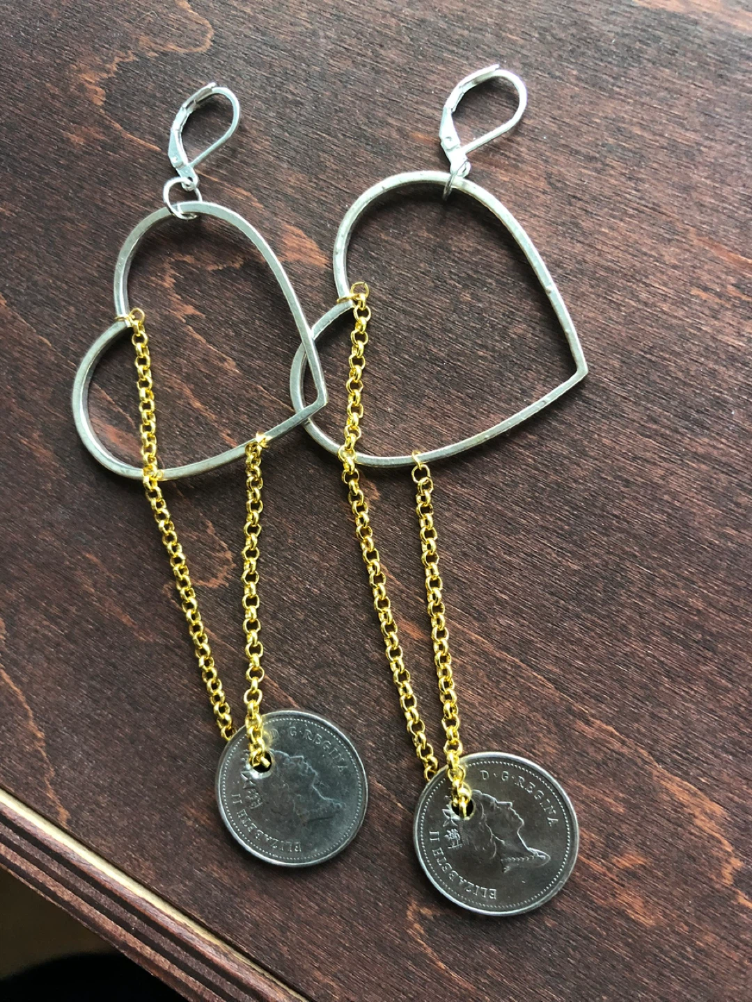 Unique handmade earrings featuring Canadian coins! These dangle earrings have a silver-tone heart shape with gold-tone chains and Canadian coins. The earrings are made of sterling silver Clasp.
