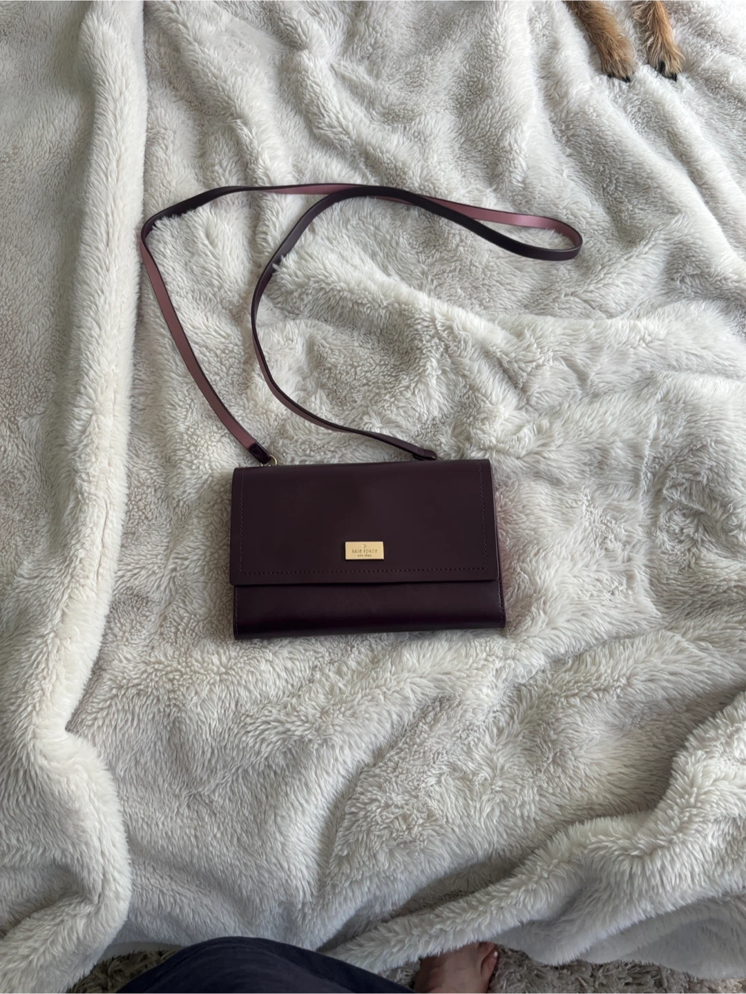 Selling a Kate Spade crossbody wallet in great condition! It's a beautiful two-tone colour, with a darker purple exterior and a light pink interior. Perfect for keeping your essentials organized while on the go