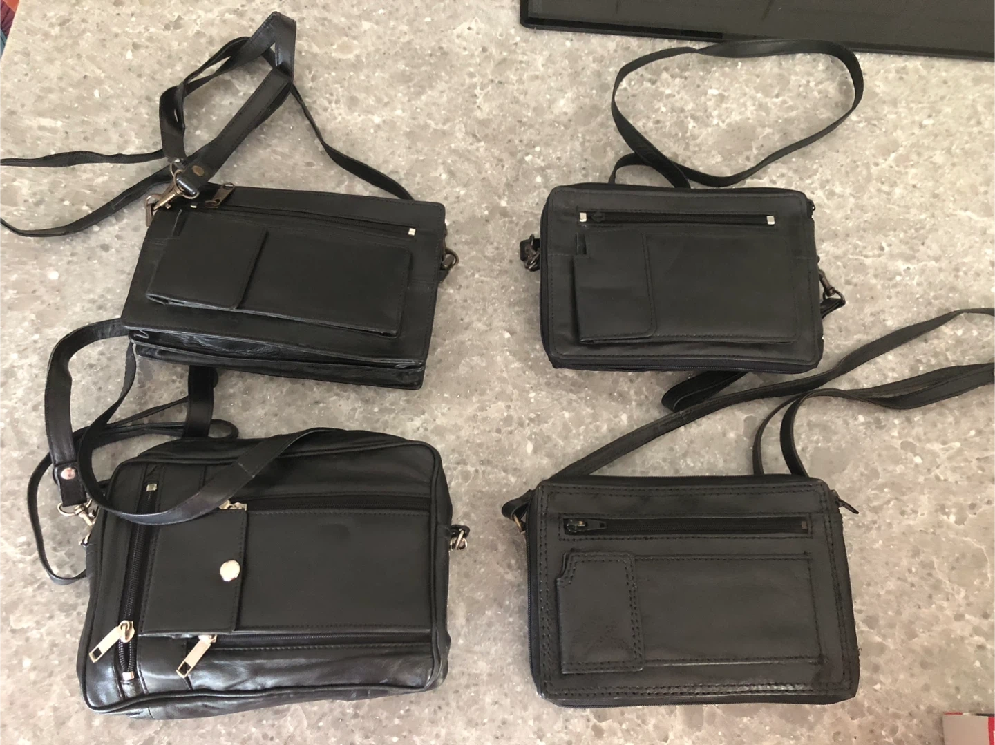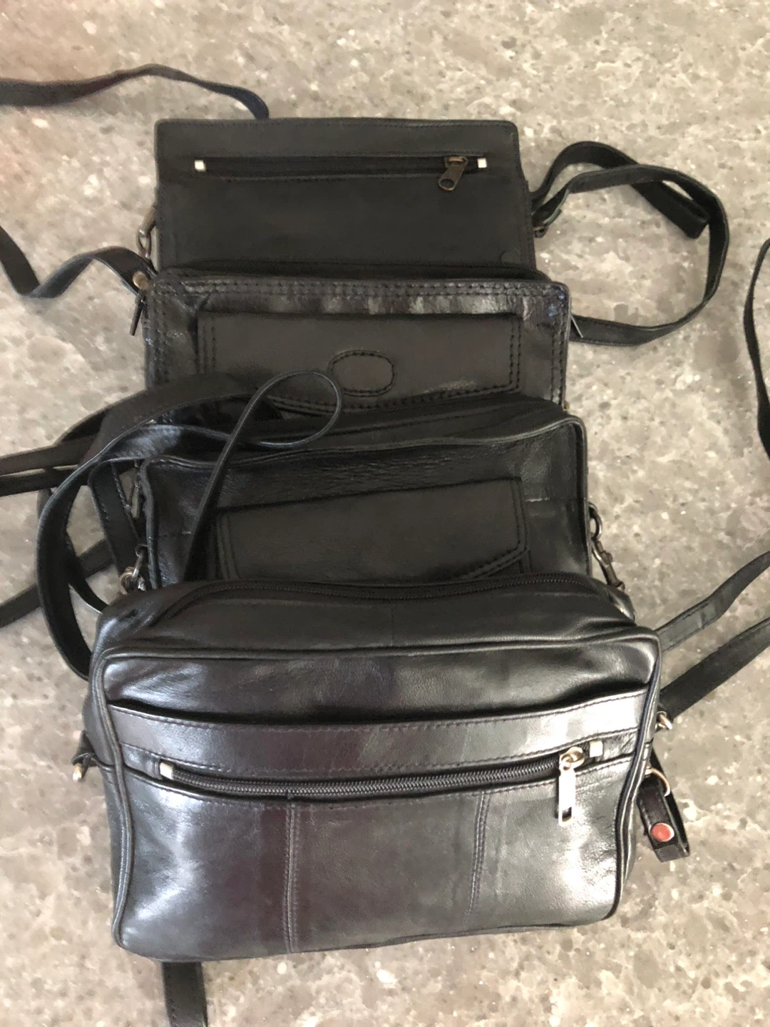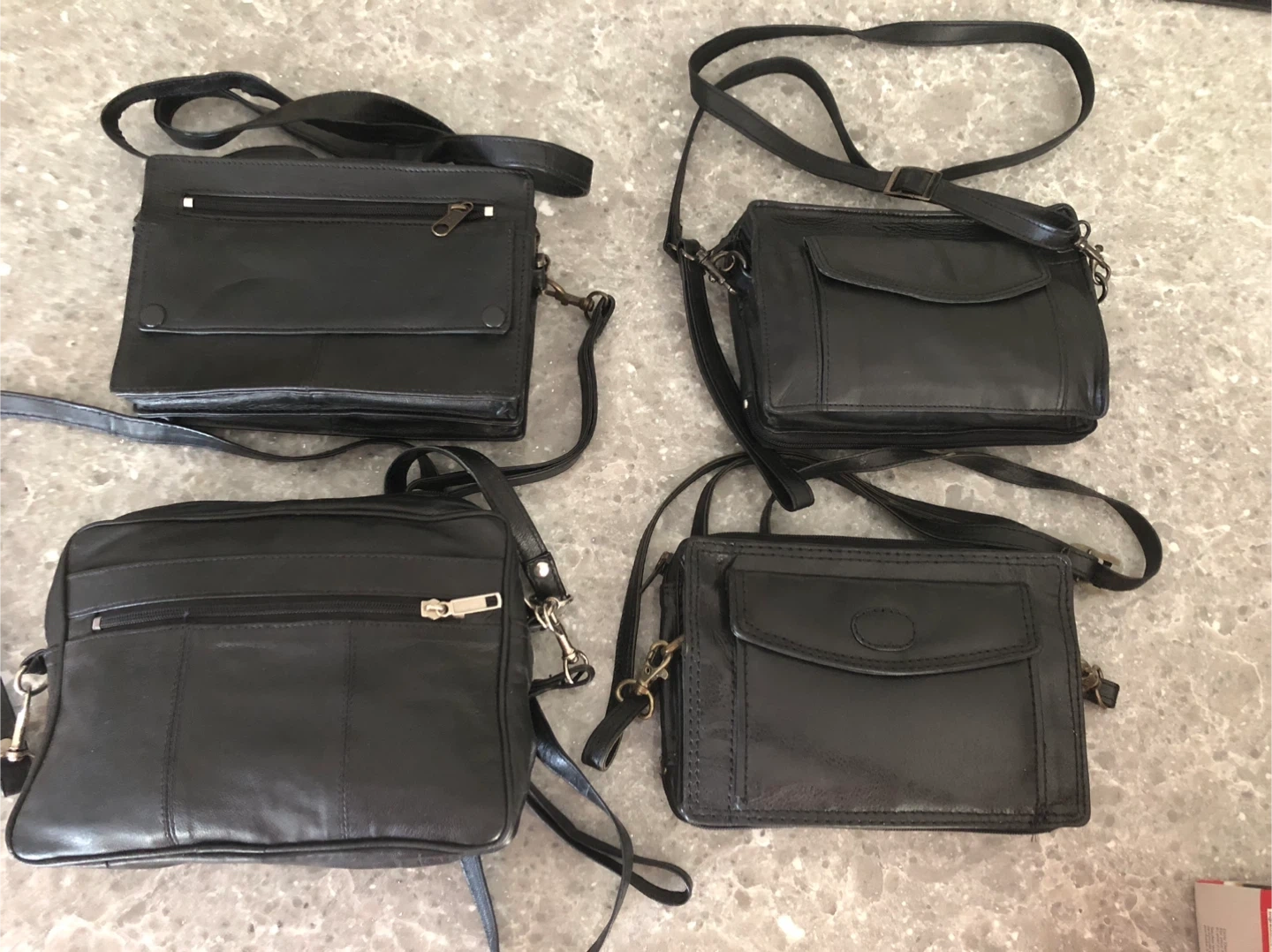 Selling four black leather crossbody bags. They're in new condition. Each one is slightly different but all have wristlets and shoulder straps, they each have a cell phone pocket, they each have a built in wallet area for cards and cash. Perfect for everyday use or travel.