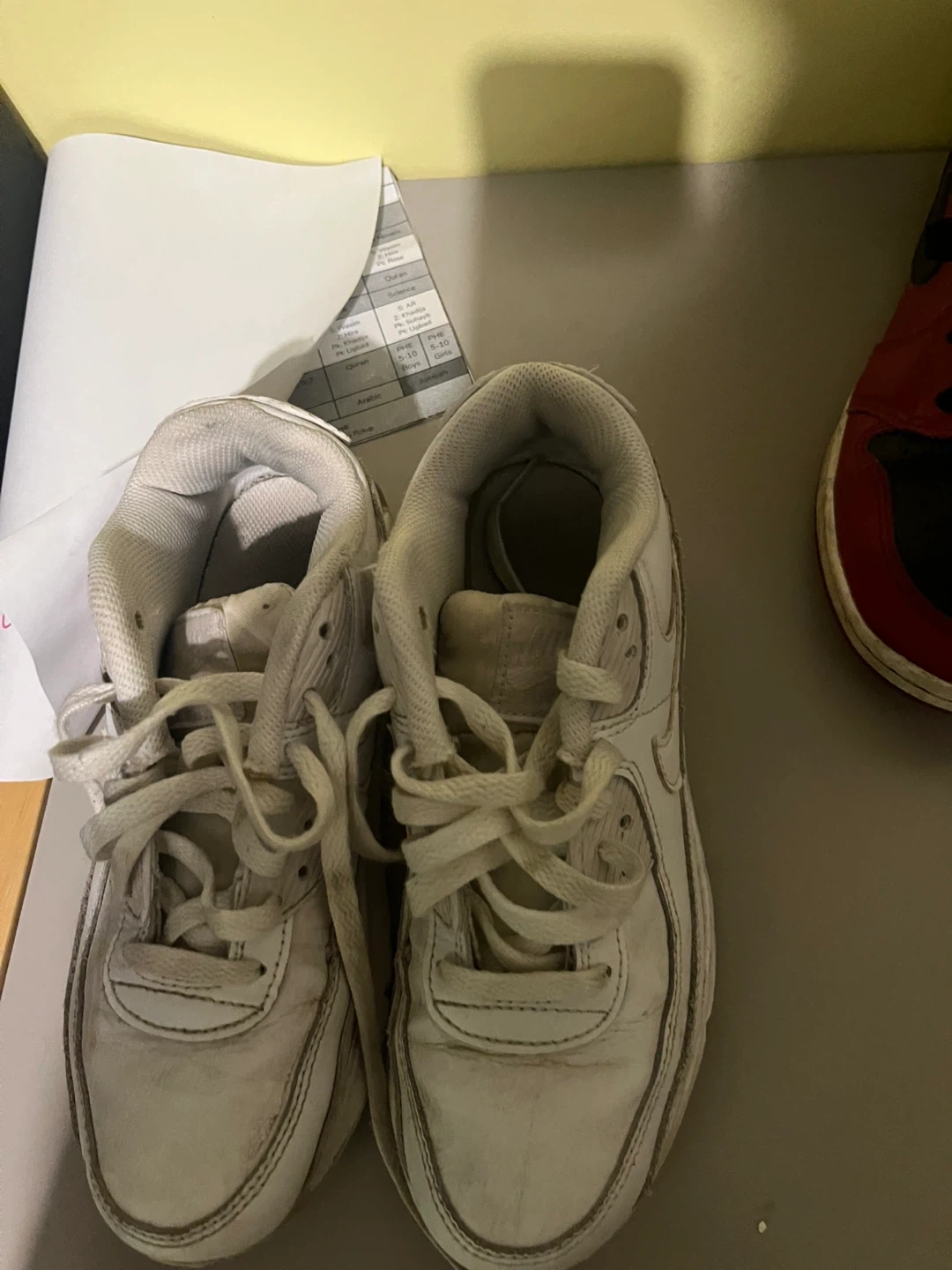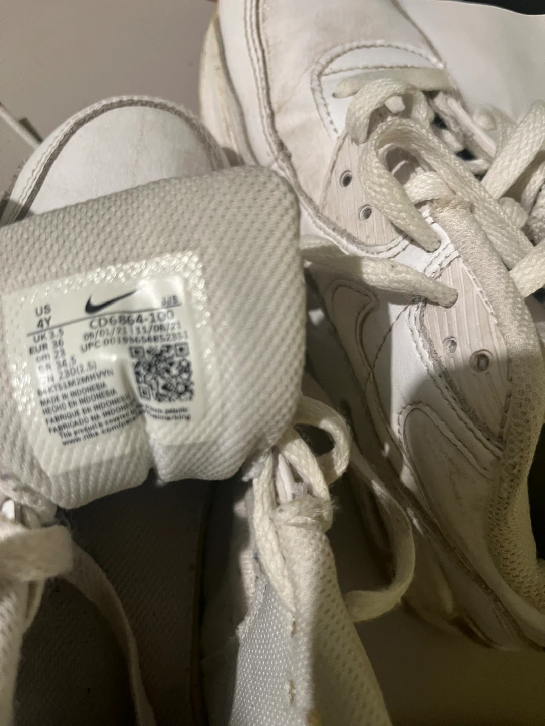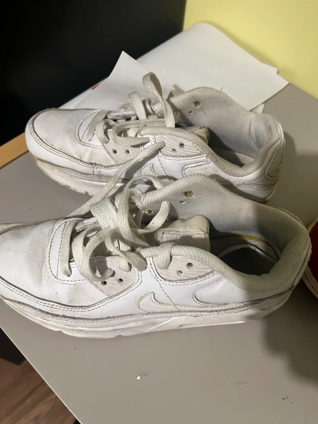 77Selling a pair of Nike Air Max 90 in US size 4Y. They're white and have definitely been used, as you can see in the pictures!