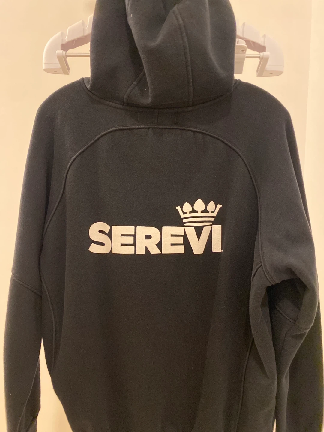 Selling a SEREVI black hoodie. It features the brand's logo on both the front and back. The hoodie is in great condition and ready for a new home. Pick up only!