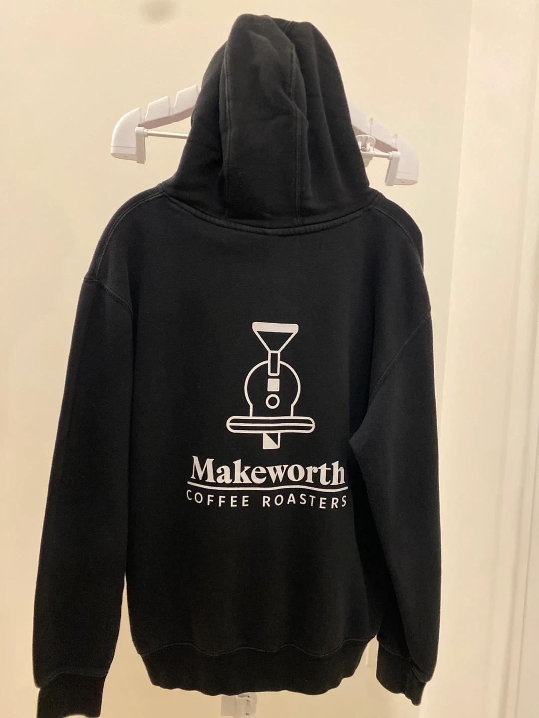 Selling a Makeworth Coffee Roasters hoodie in black. It's in great condition and features the company's logo on the front and back. Perfect for any coffee lover! Pick up only! Size L!