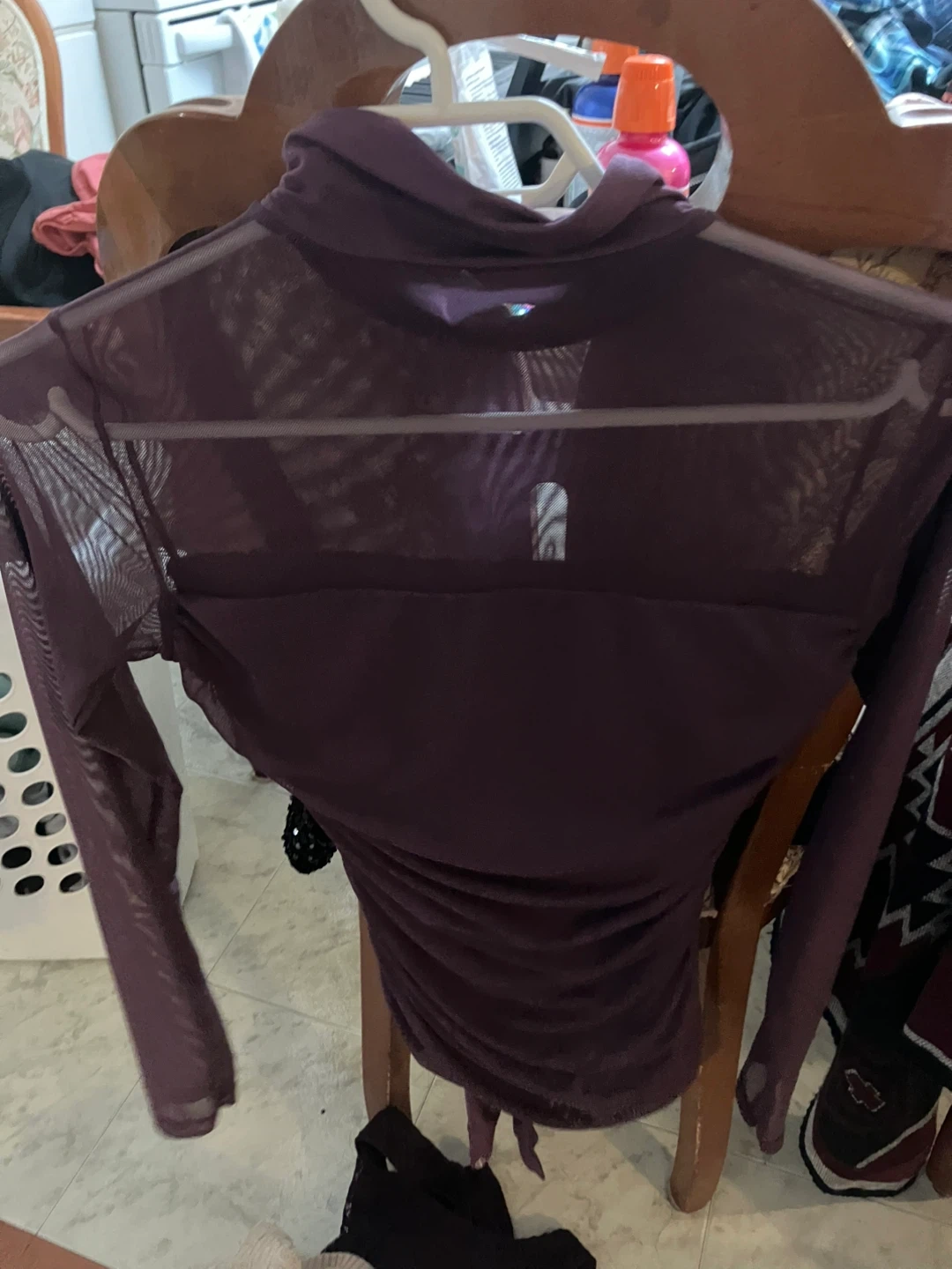 10Selling a cute purple long sleeve mesh top. It has a high neckline and a cinched side detail. Perfect for layering or wearing on its own! Only worn once