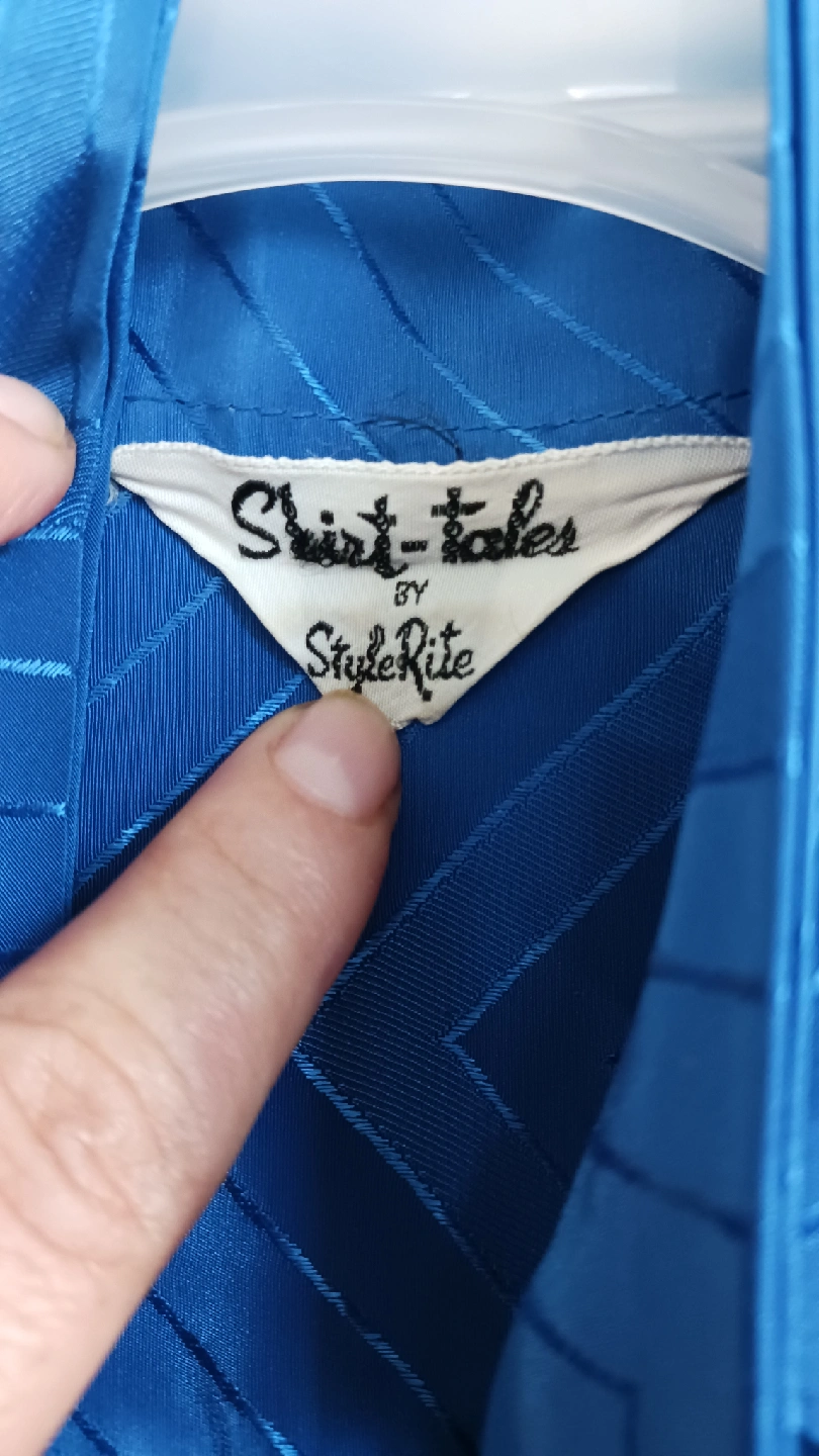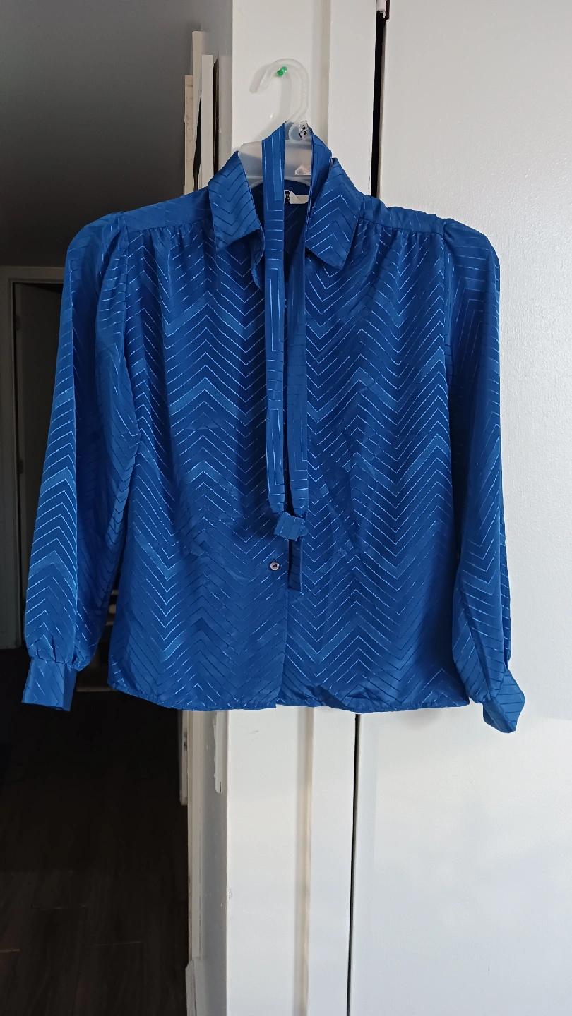 1000+Here's a cute vintage blue blouse from Shirt-Tales by StyleRite! It features a unique chevron pattern and a tie neck detail. Perfect for adding a touch of retro style to your wardrobe