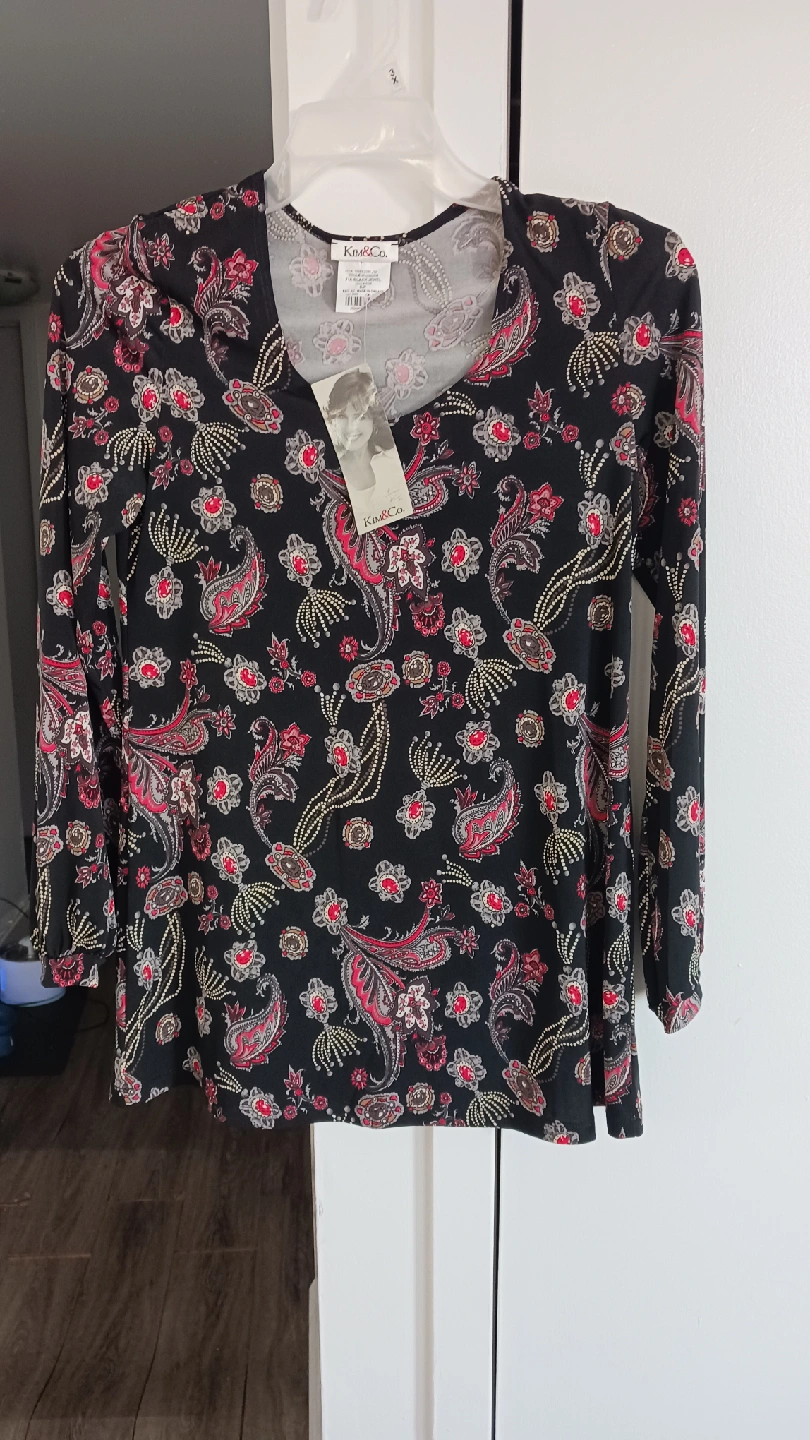 1000+Selling a Kim & Co. top in size XL! It features a beautiful floral paisley print on a black background. New with tags