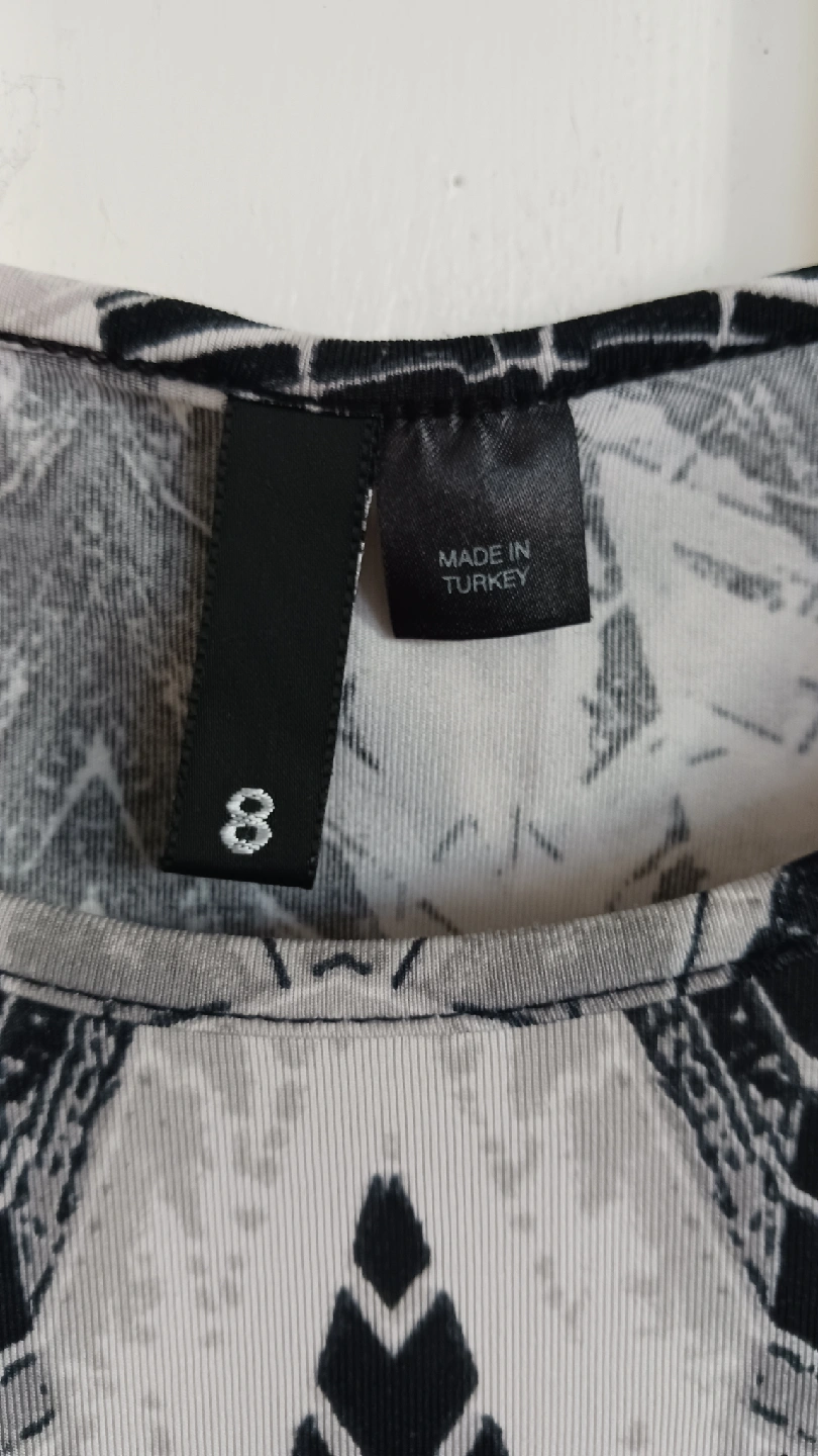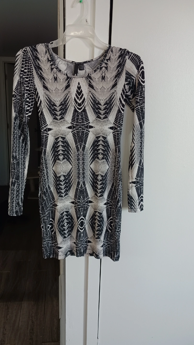 1000+Selling a cute H&M bodycon dress in size 8. It features a unique black and white pattern and long sleeves. Perfect for a night out or a special occasion!