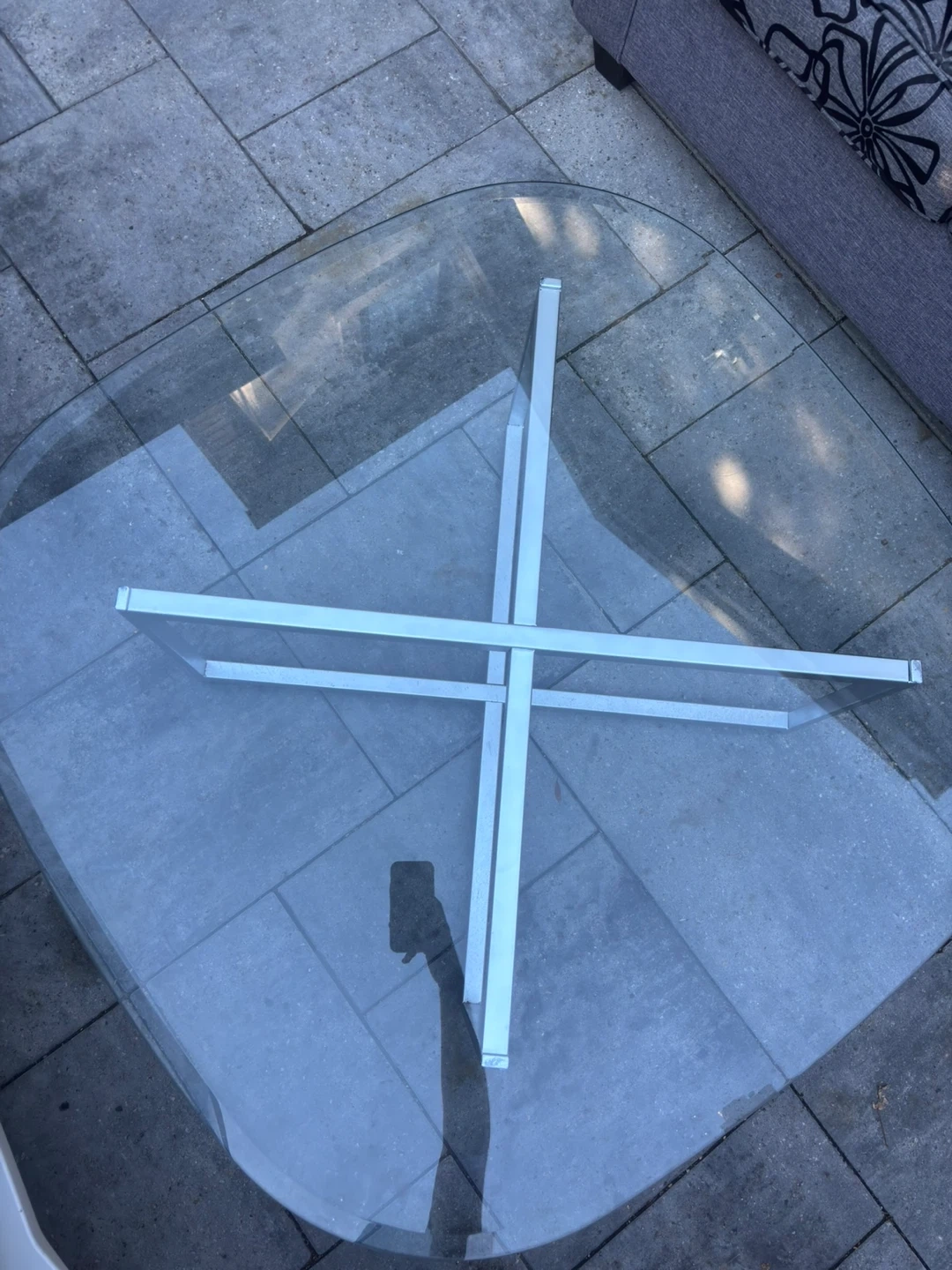 Selling a glass coffee table with metal legs. It has a modern design and would look great in any living room! There is also a rug in the background of the photo.