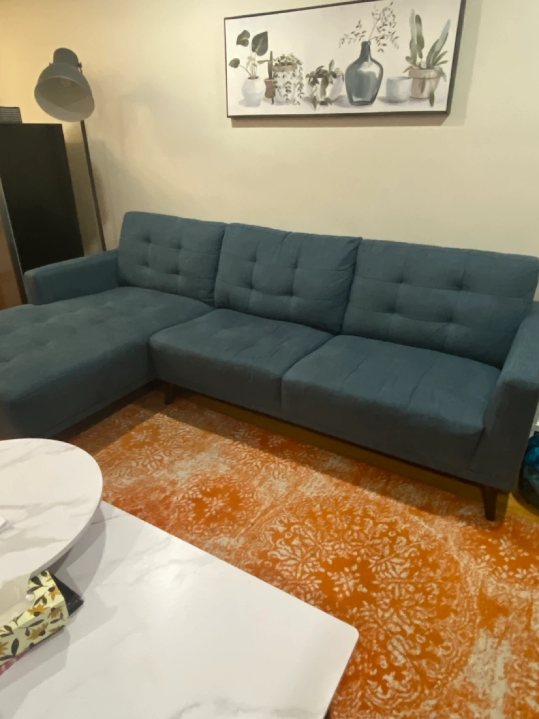 This blue sectional sofa features a chaise lounge for extra comfort. It's upholstered in a durable fabric with button-tufted detailing on the back cushions. The sofa's wooden legs provide a sturdy foundation.