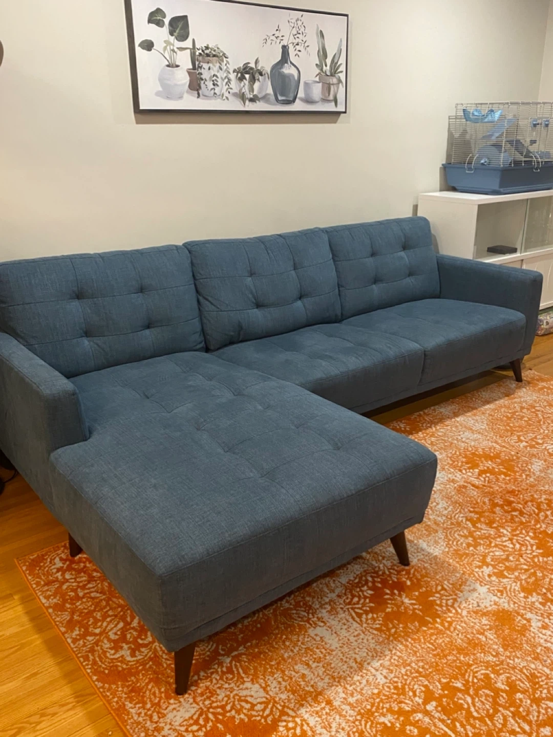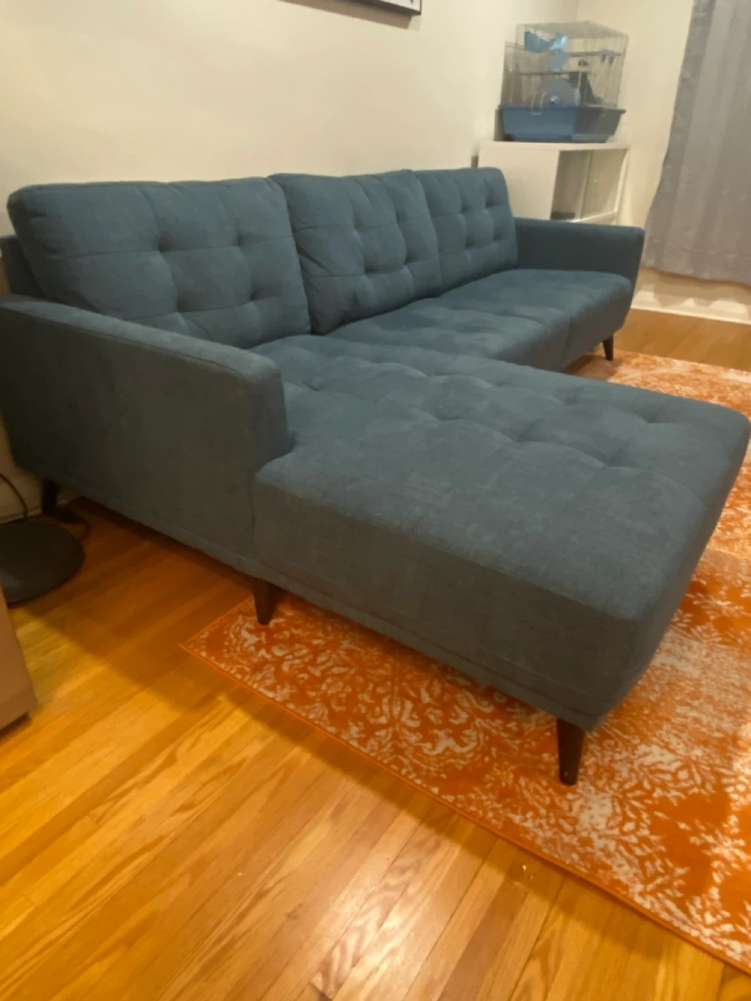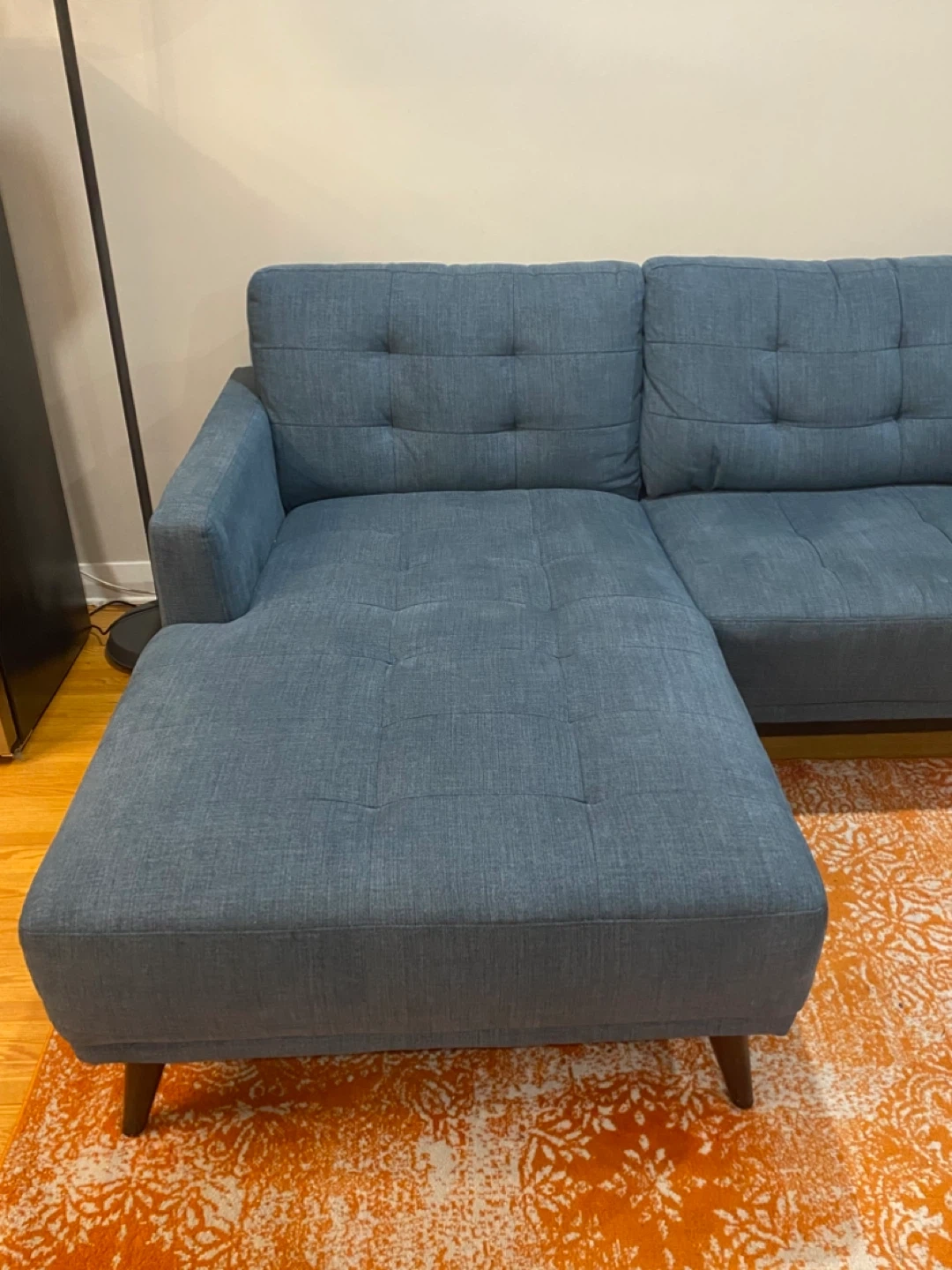 This blue sectional sofa features a chaise lounge for extra comfort. It's upholstered in a durable fabric with button-tufted detailing on the back cushions. The sofa's wooden legs provide a sturdy foundation.
