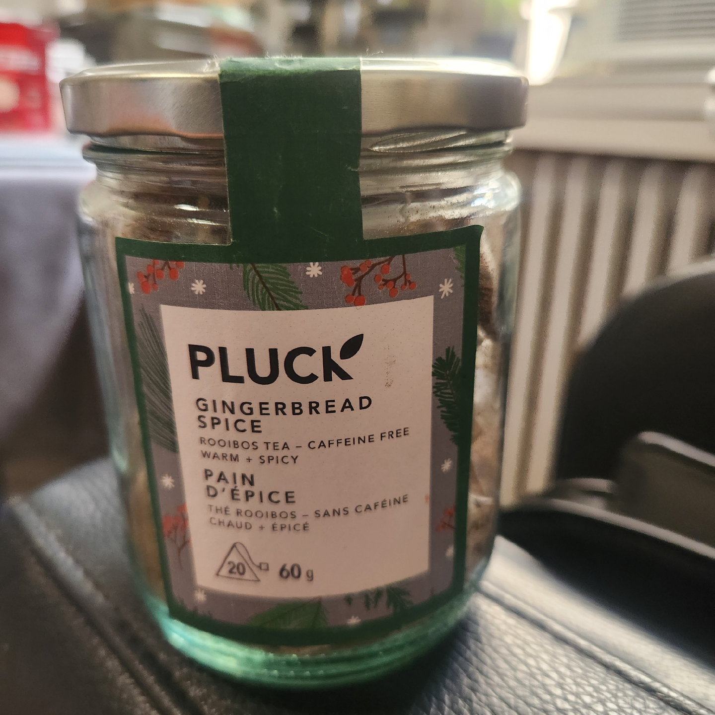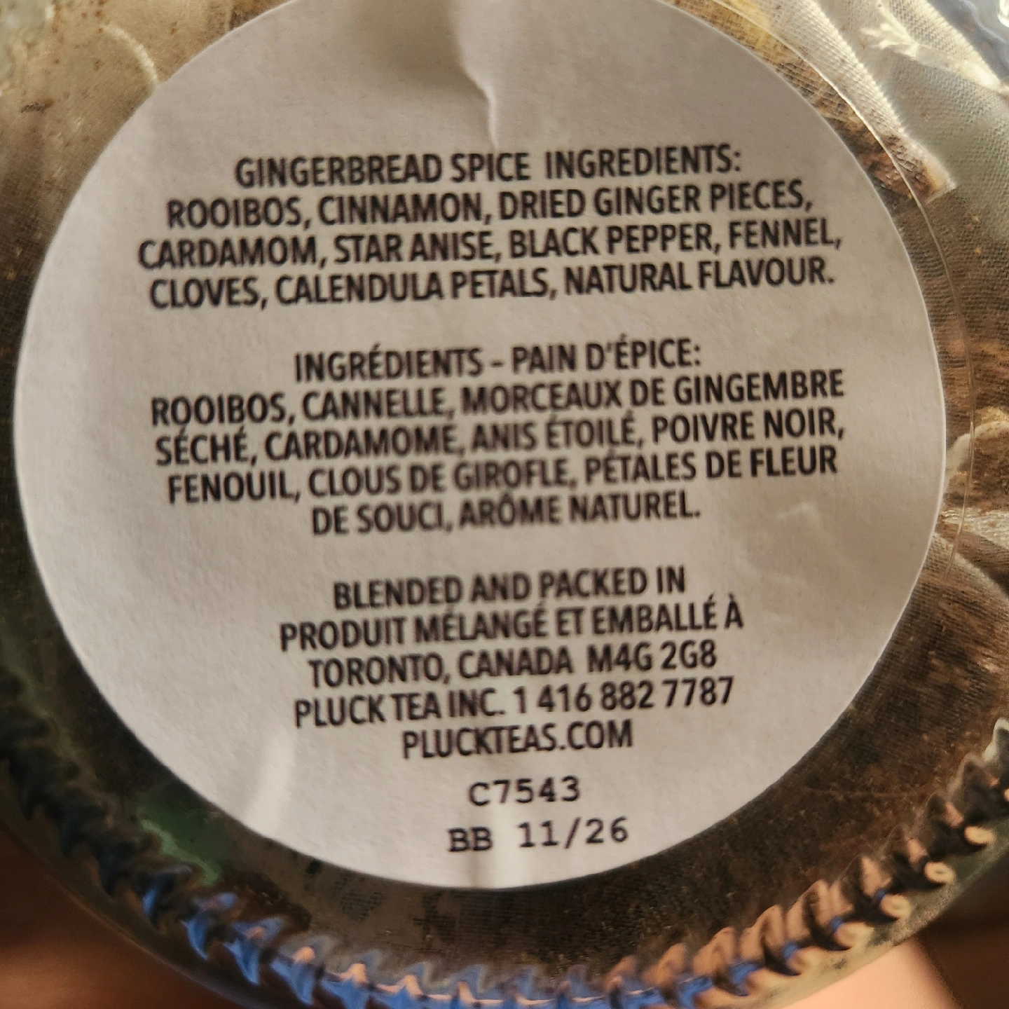 Enjoy a warm and spicy caffeine-free rooibos tea with Pluck's Gingerbread Spice blend! This tea is blended and packed in Toronto, Canada. The ingredients include rooibos, cinnamon, dried ginger pieces, cardamom, star anise, black pepper, fennel, cloves, calendula petals, and natural flavour. Best before November 2026!
