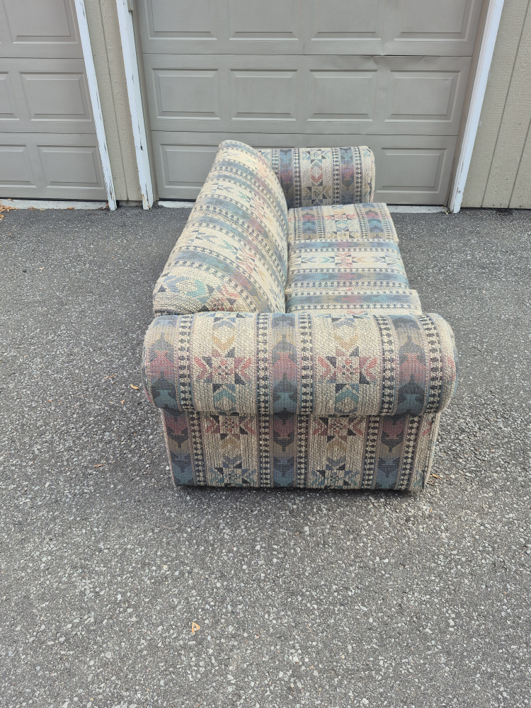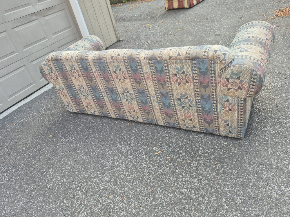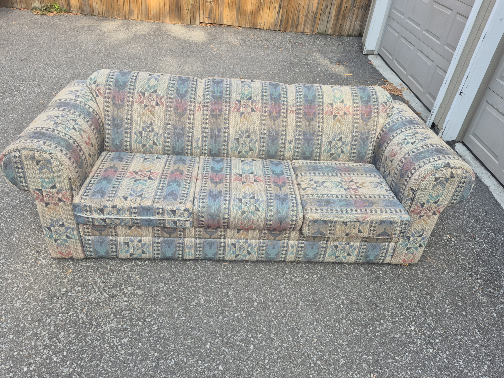 Selling a comfy three-seat sofa with a unique patterned design! It's in good condition and ready for a new home. Perfect for adding a touch of style to your living room or den