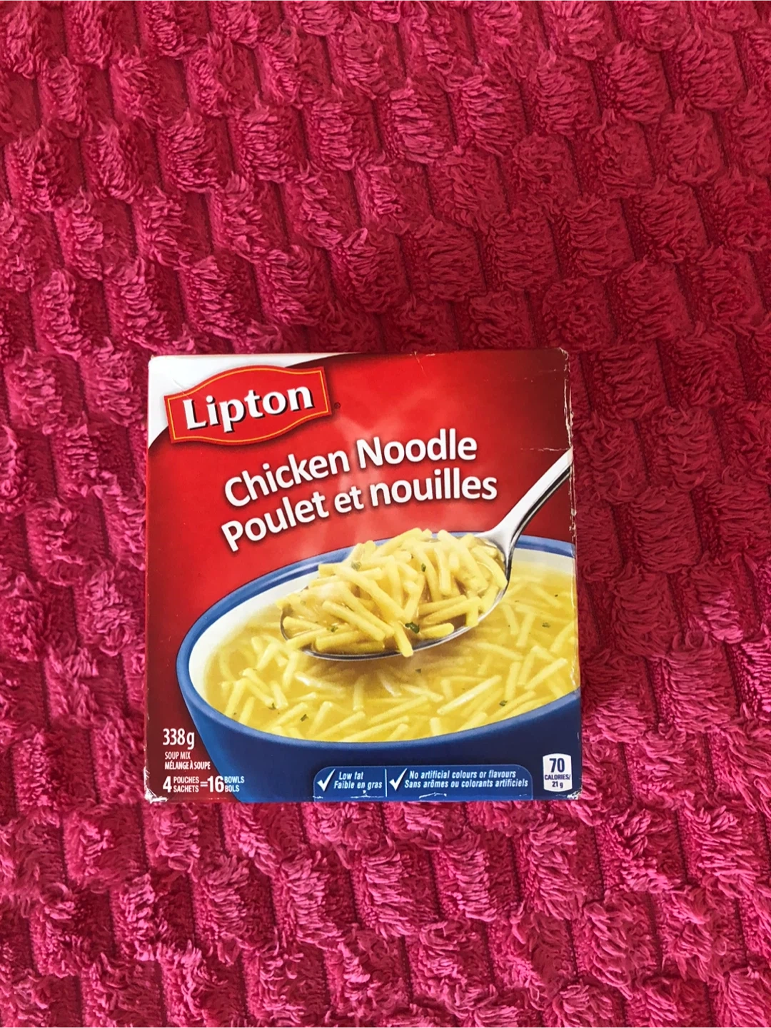 Lipton Chicken Noodle Soup Mix, perfect for a quick and comforting meal! Each box contains 338g of soup mix, enough for about 16 bowls. It's low in fat and has no artificial colours or flavours.