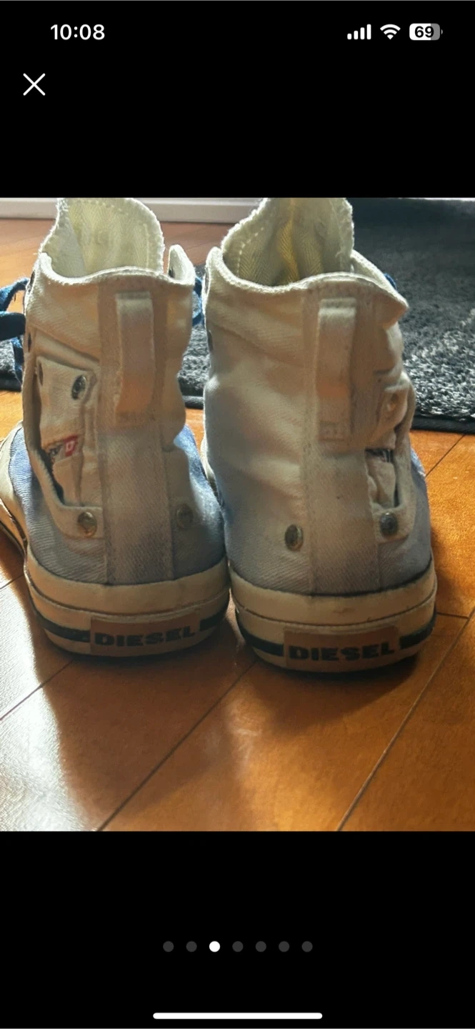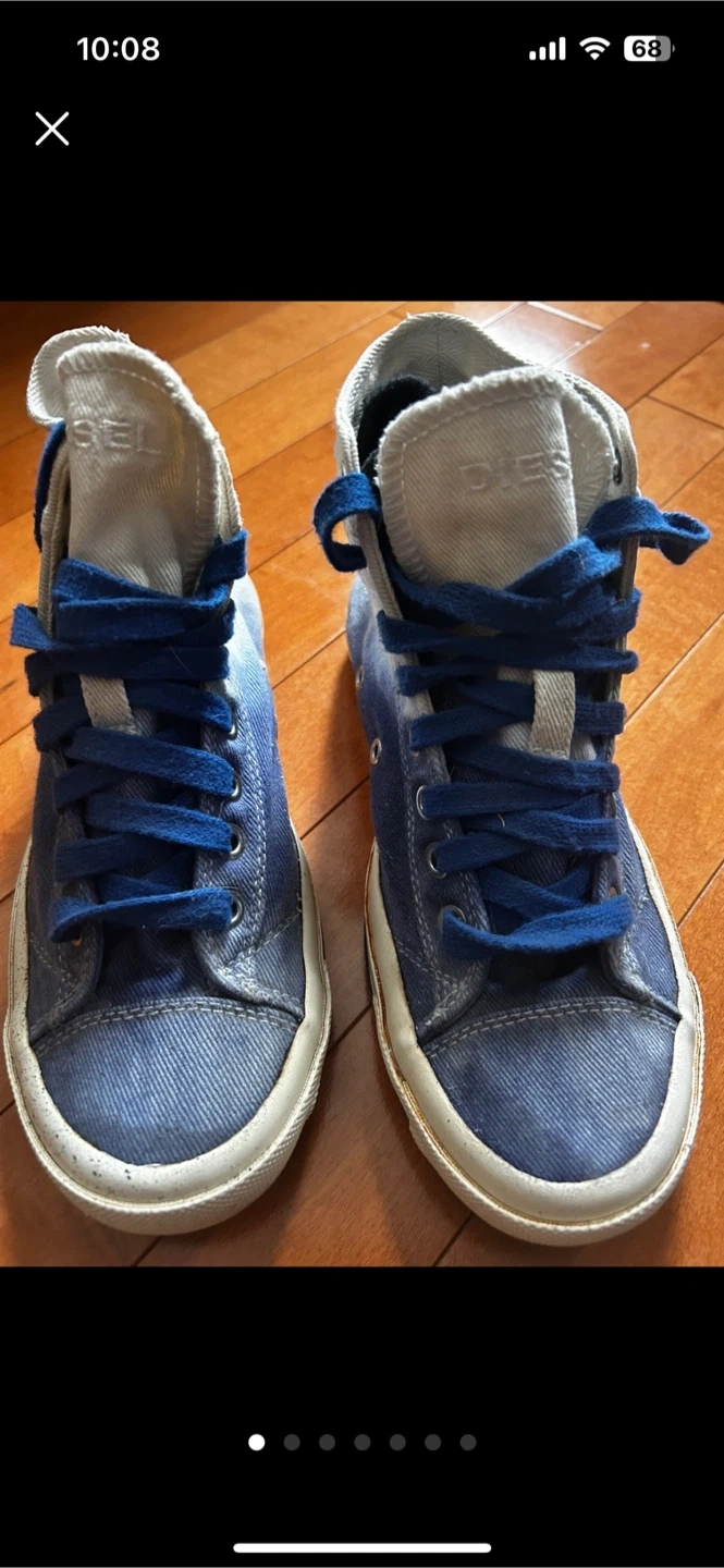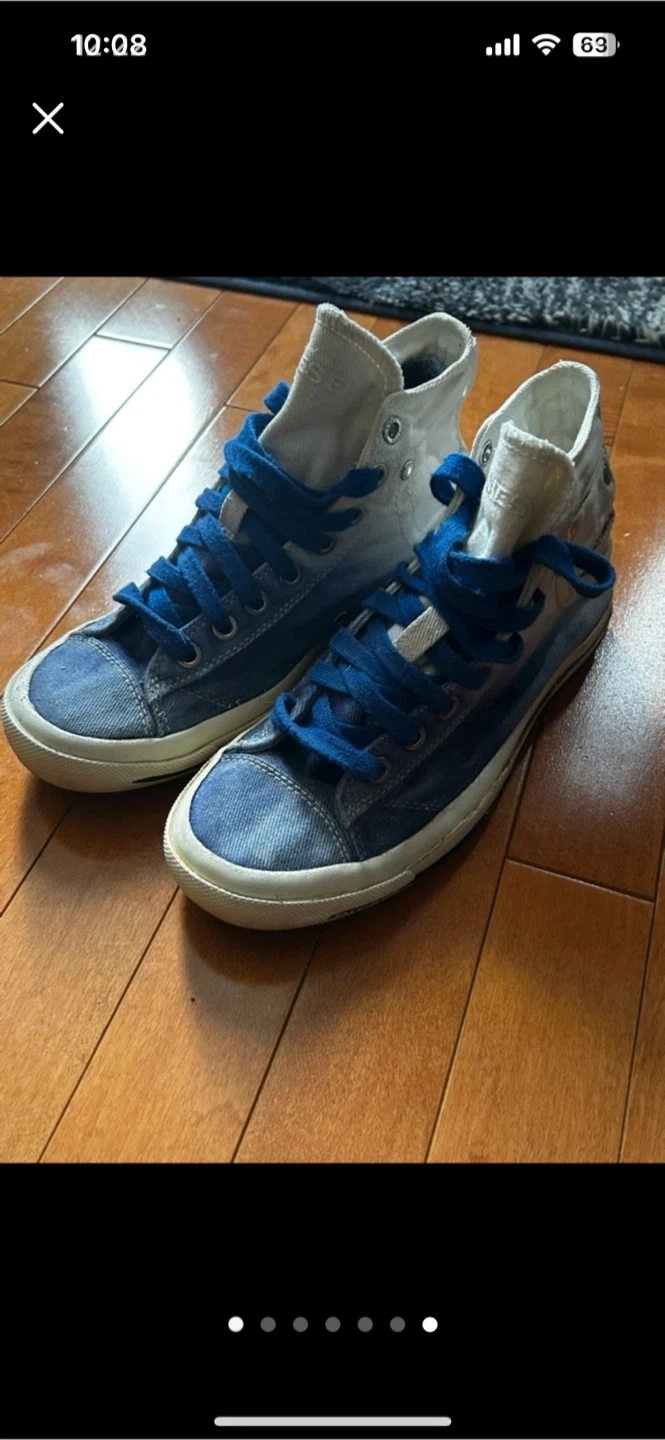414Diesel denim high top sneakers in a faded blue and white. These stylish sneakers feature blue laces and the Diesel logo on the side. They're in excellent condition and ready for a new home!