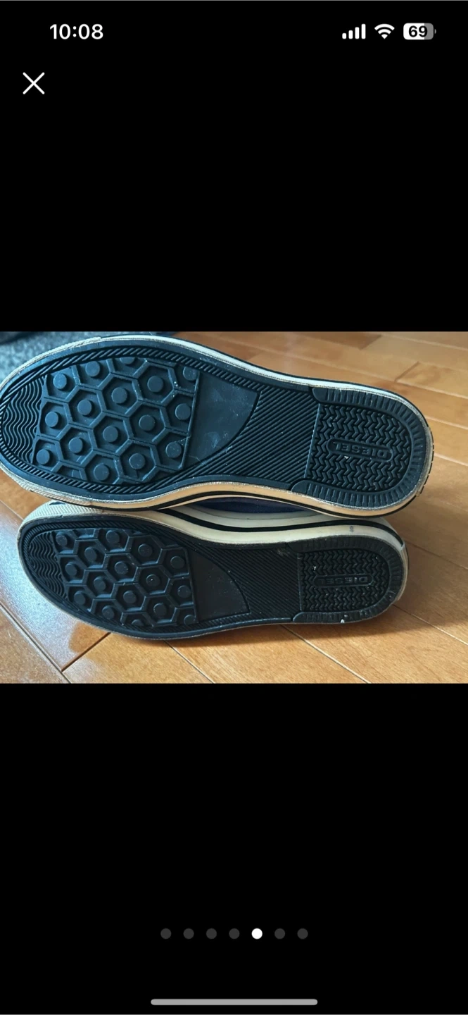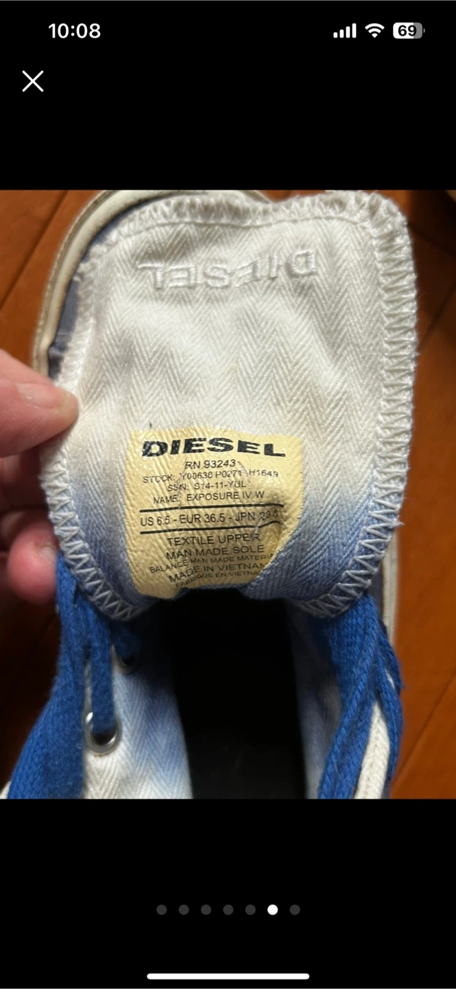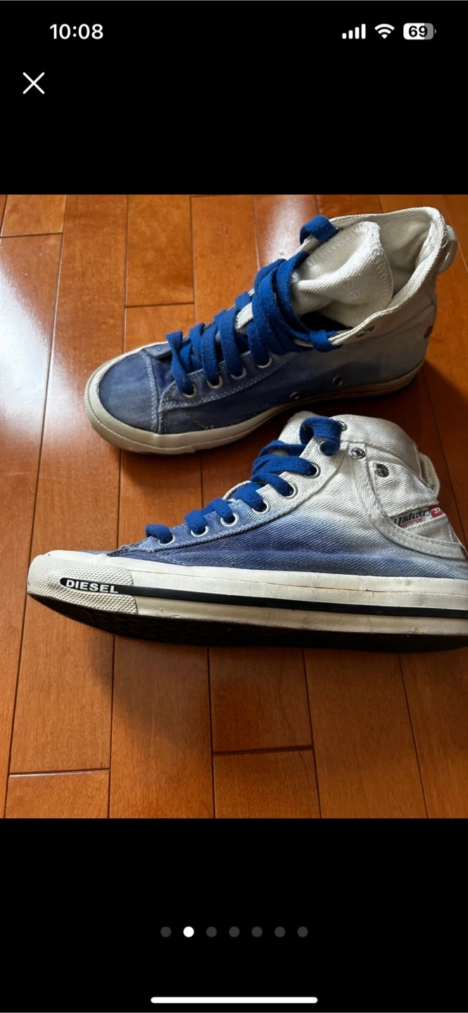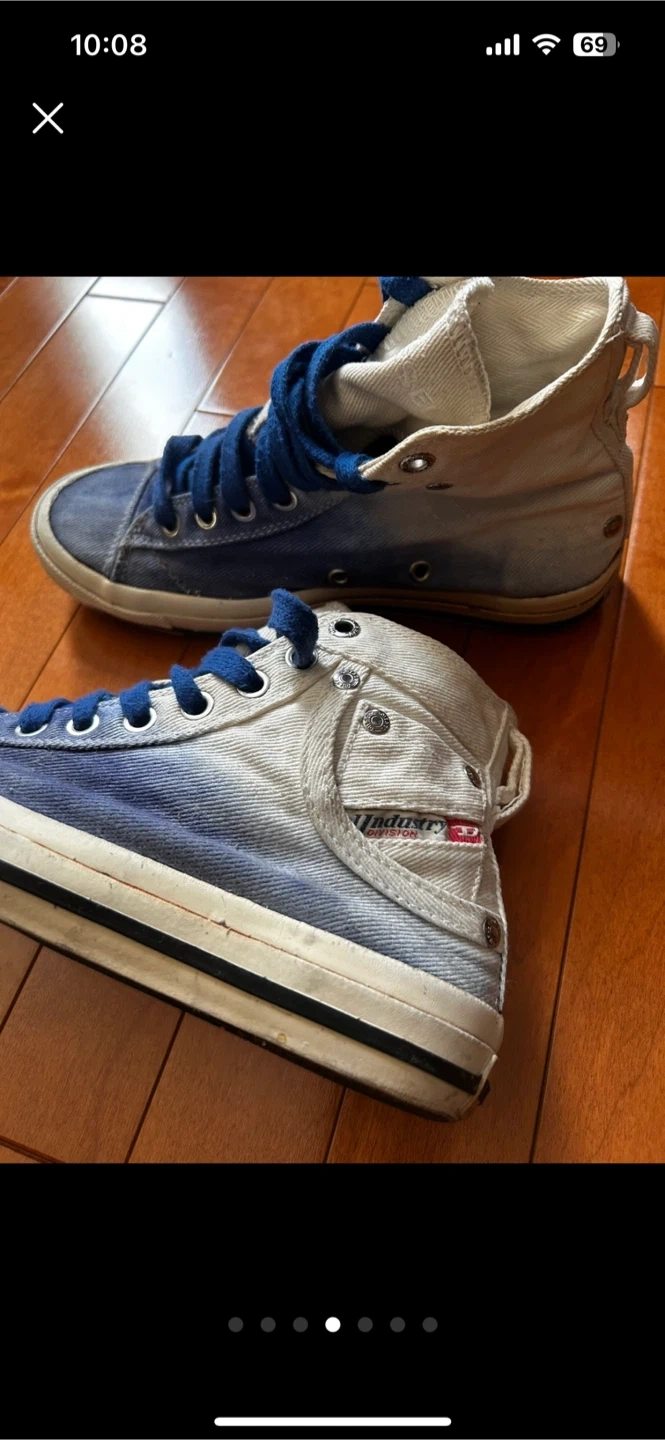414Diesel denim high top sneakers in a faded blue and white. These stylish sneakers feature blue laces and the Diesel logo on the side. They're in excellent condition and ready for a new home!