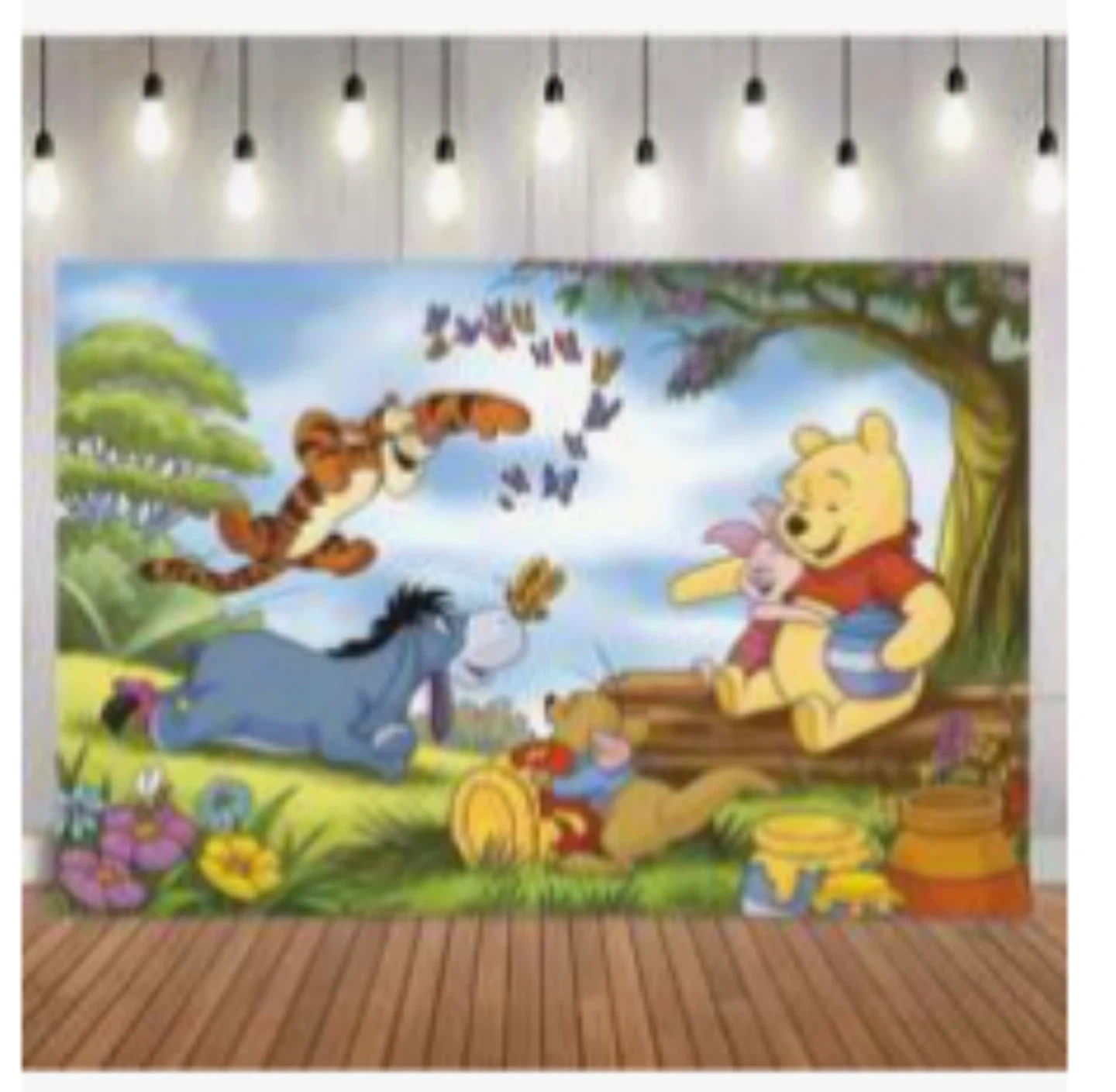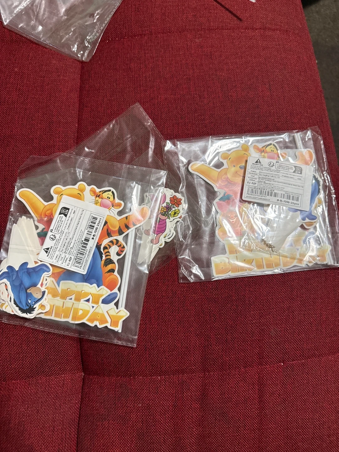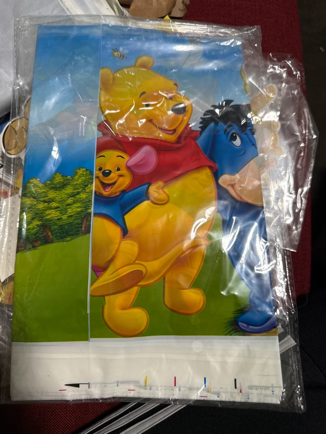 I have Winnie the Pooh themed birthday party supplies. Great for a themed party! Background 210*150 cm , 4 tablecloth (2 open, 2 new), new napkins, 2 set of cake toppers with cupcake toppers , and 2 new ribbon.