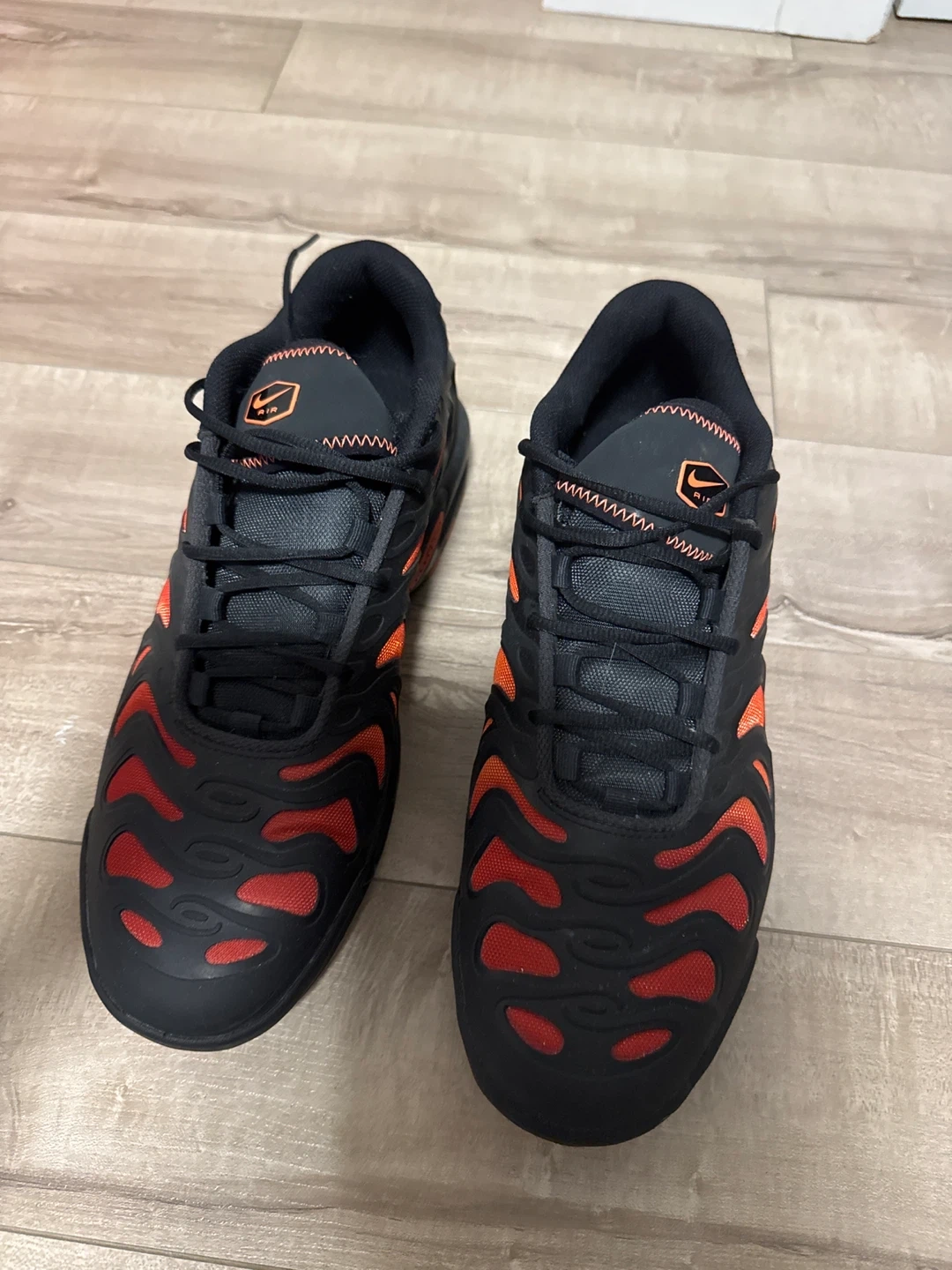 Selling a pair of Nike Air Max Plus TN in black and orange. These shoes are in great condition and ready for a new home! They feature the classic TN design with a comfortable fit. Perfect for everyday wear or hitting the gym. ($75firm )