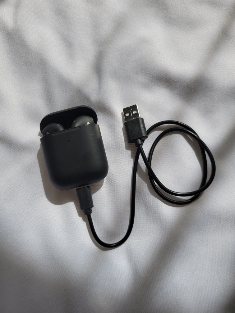Selling a pair of black wireless earbuds, complete with their charging case and USB charging cable! They are non-functioning/need repairs