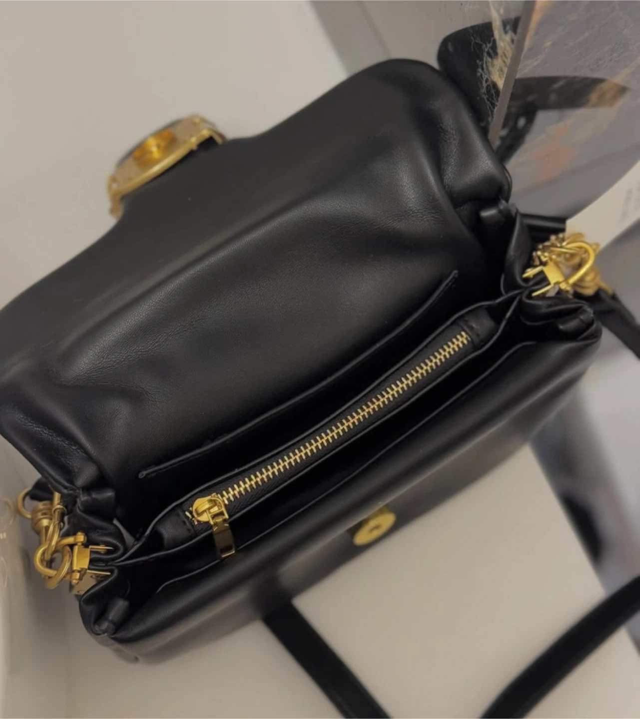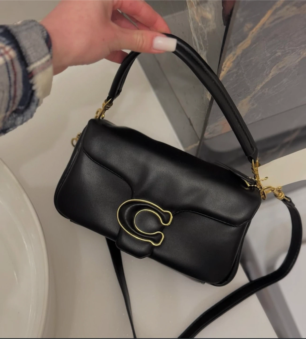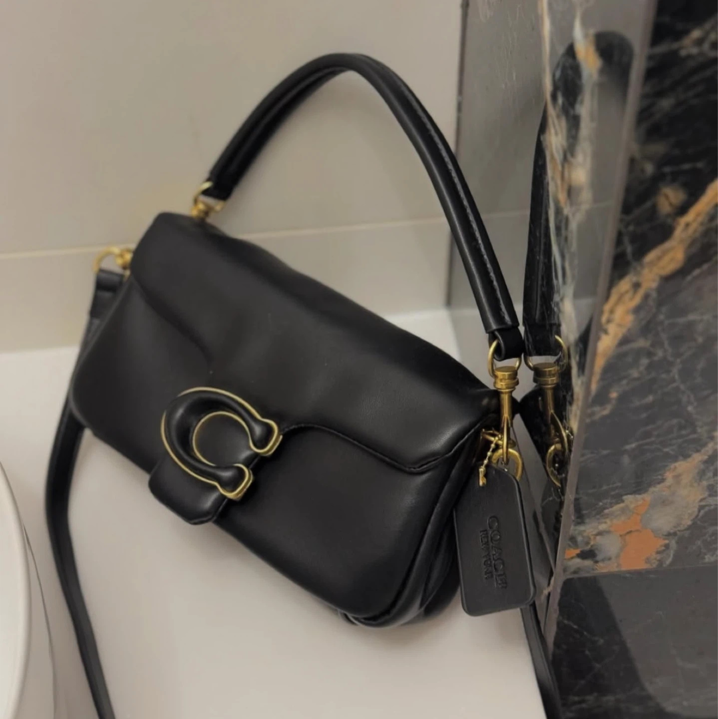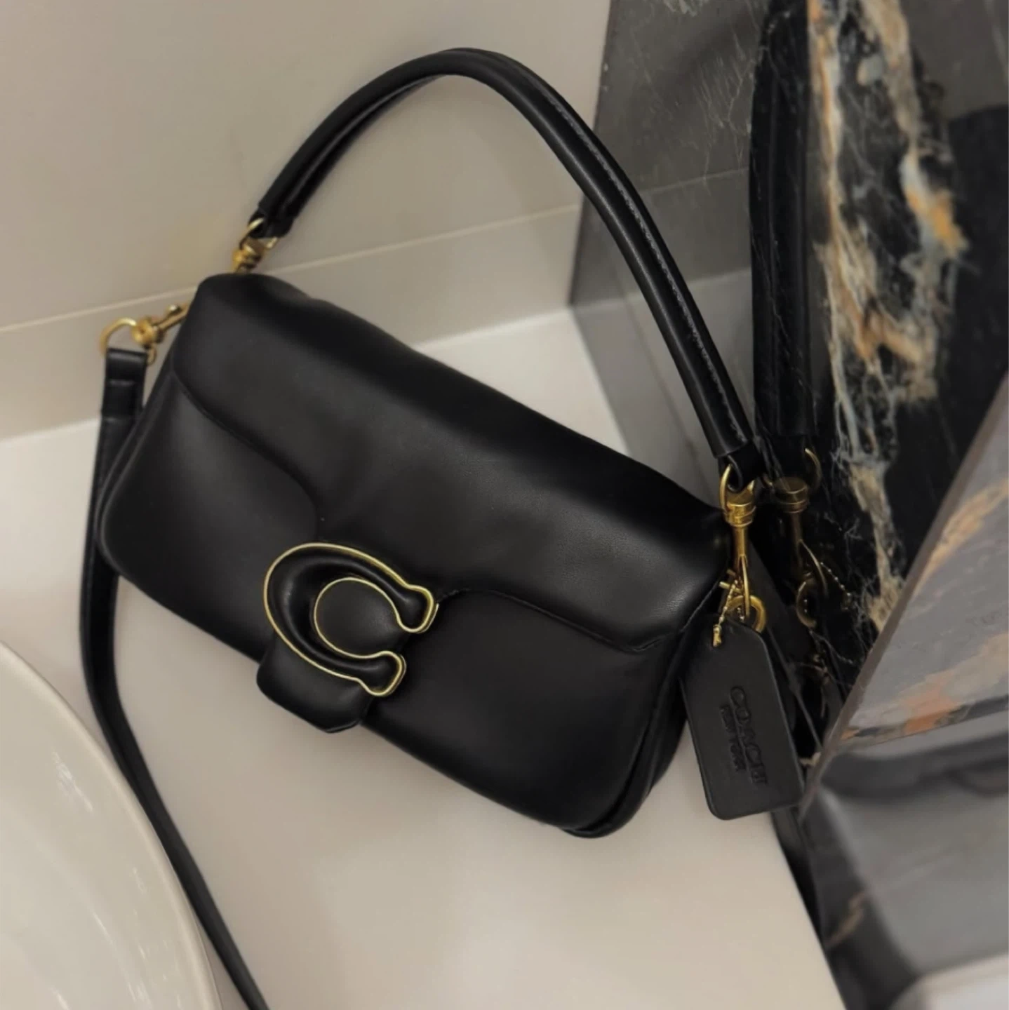 Selling a Coach Pillow Tabby 18 in black leather! It's a super cute and stylish bag. The bag features the iconic Coach 'C' clasp. It's in new condition and ready for a new home!
