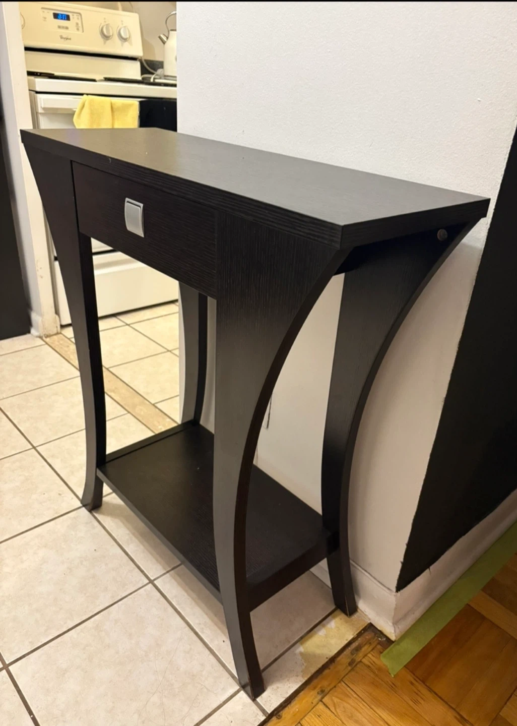 A stylish dark brown console table, perfect for entryways or living rooms. It features a convenient drawer for storage and a lower shelf for display. Measures approximately 32 inches in length.