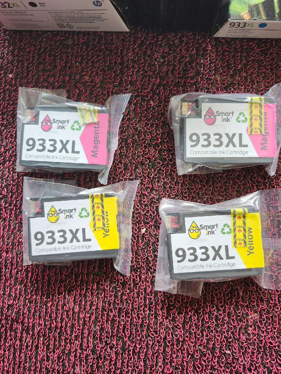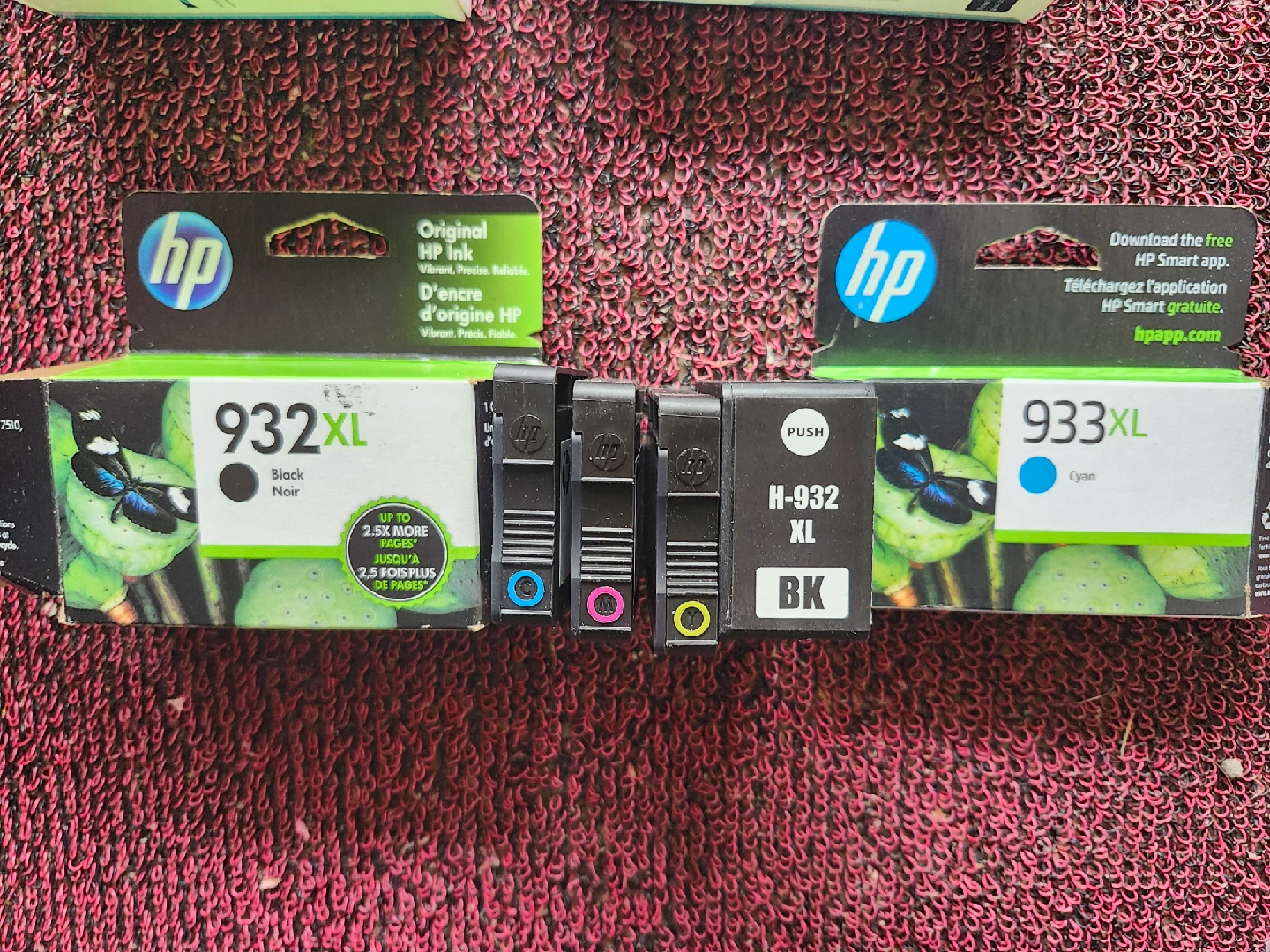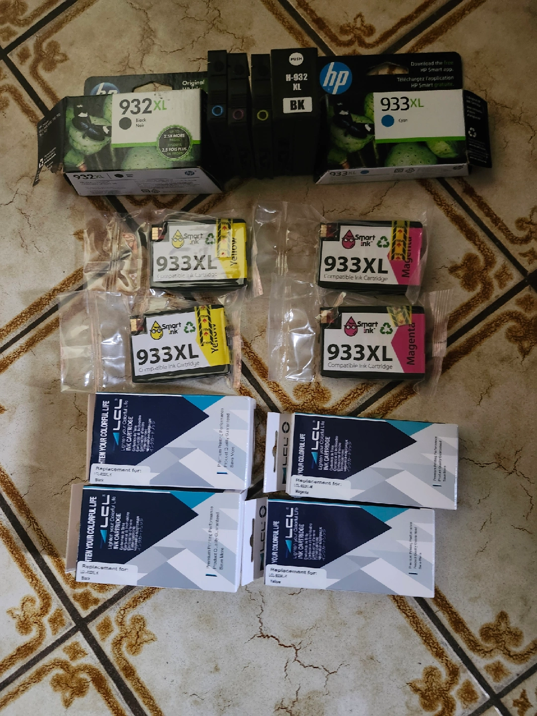 18There are a total of 14 Print cartridges which are HP 933XL black and HP 932XL colours and COMPATIBLE HP cartridges black and colours all for $15.00 Cash. There are 4 HP cartridges opened and used with ink still in them. The rest are all New in sealed packs. My printer is broken and have purchased a new model which these cartridges will not fit. Please arrange for delivery at Shoppers drugmart parking lot 520 Charolais Blvd Brampton Ont.