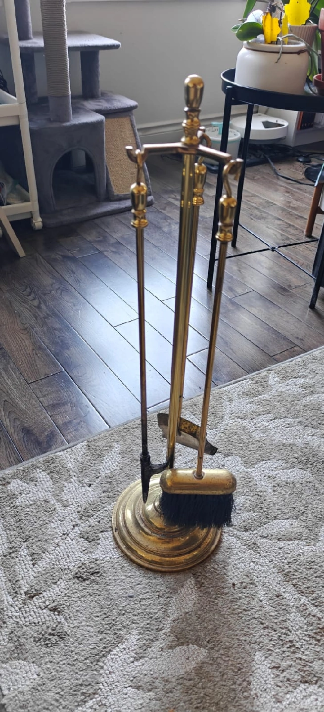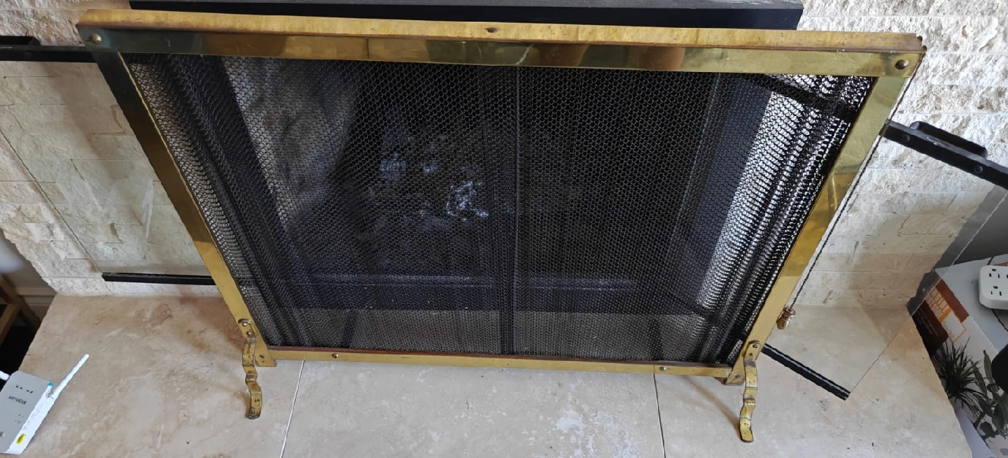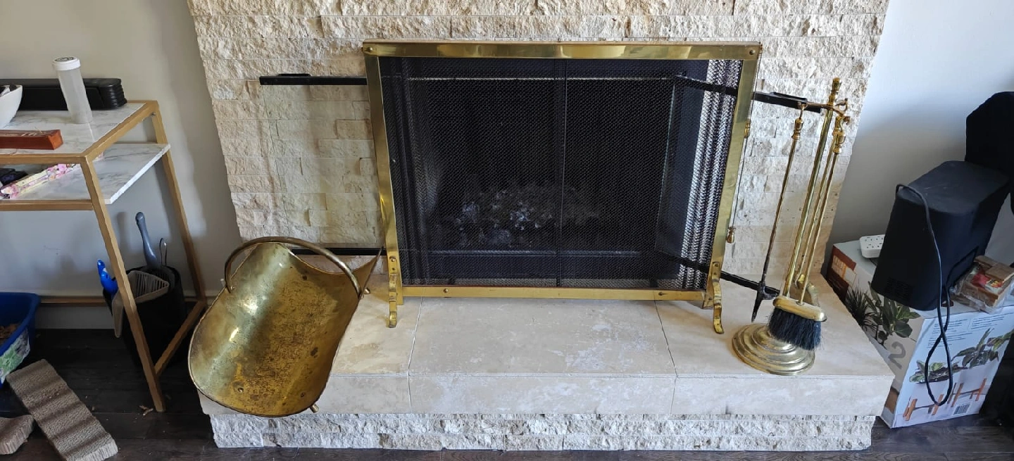 Selling a fireplace screen and tool set. Includes a screen with a brass frame, a log holder, and a set of fireplace tools. Great for adding a touch of elegance to your fireplace area!