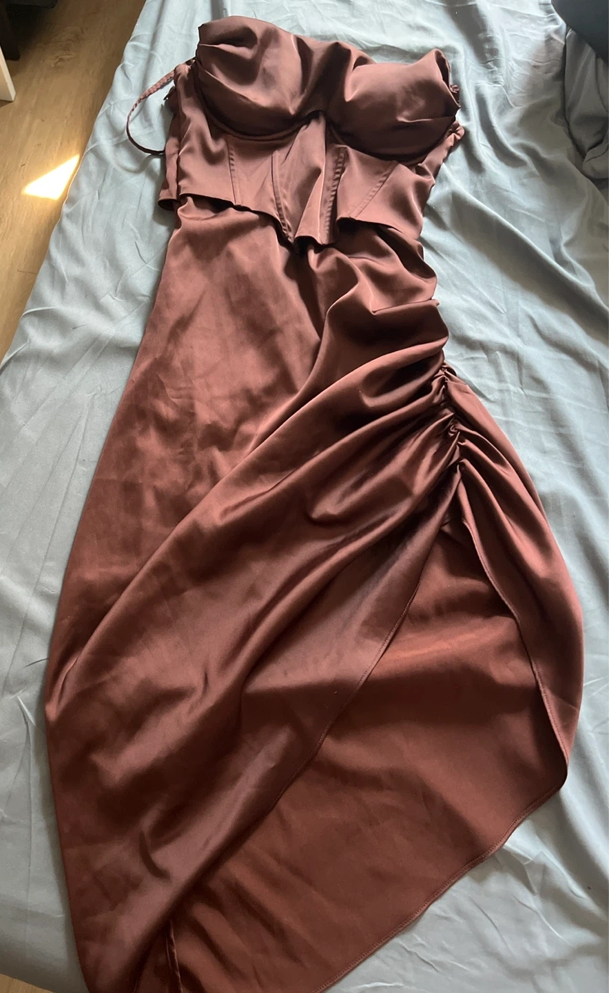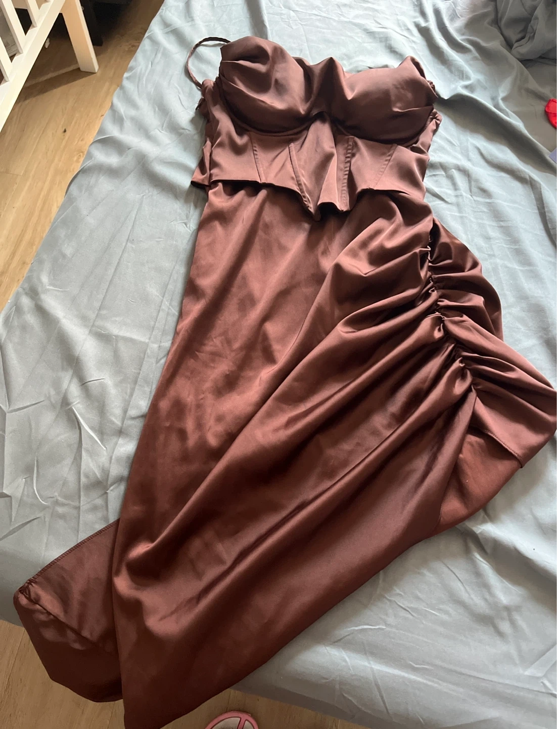 10Selling a stylish brown satin dress! The dress features a corset-style top and a ruched detail on one side of the skirt. It's perfect for a night out or a special occasion. The material is a beautiful, smooth satin that drapes nicely