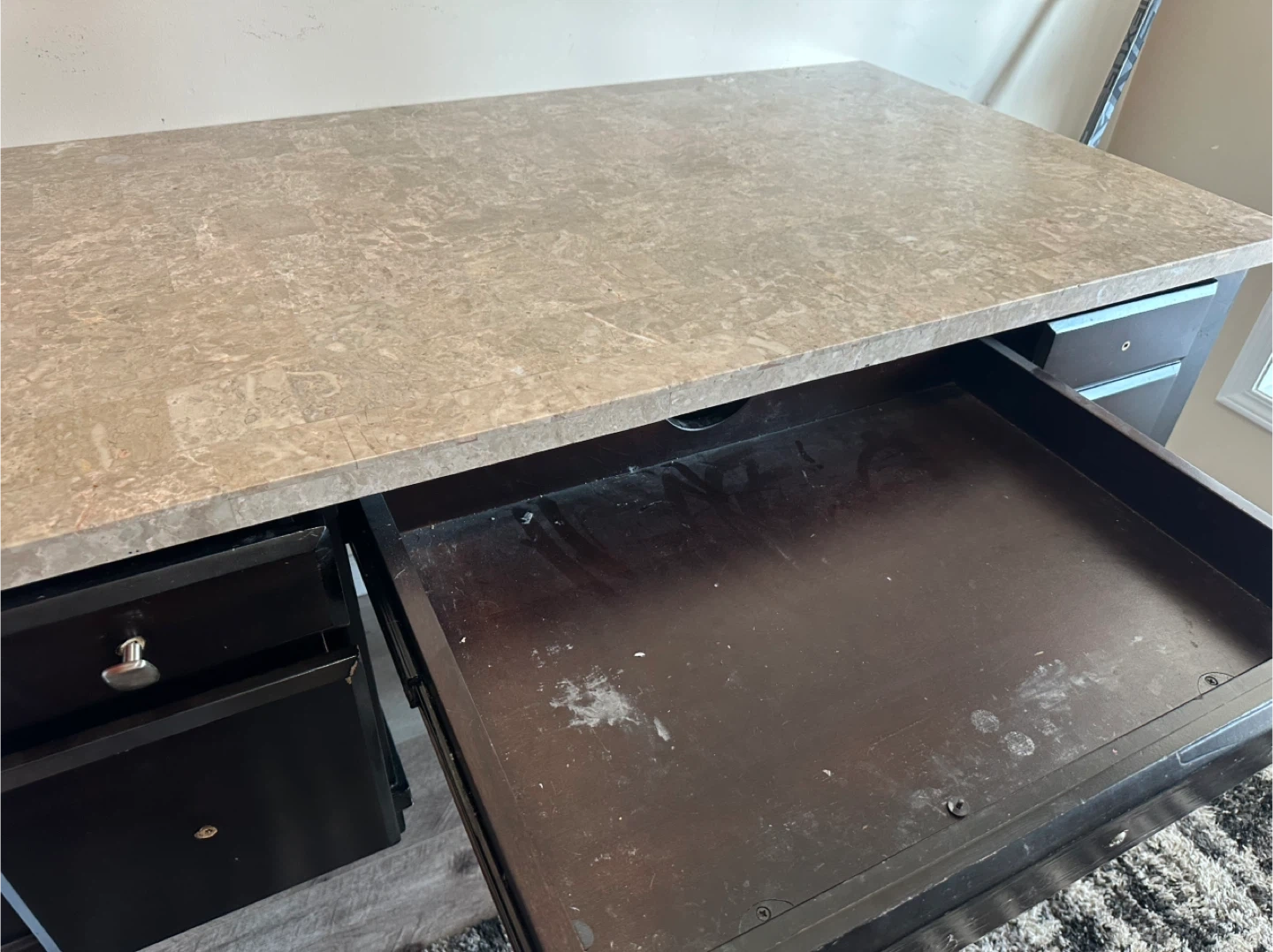 Selling a desk with a dark wood frame and a stone-like top. It features multiple drawers for storage. There are some signs of use, as pictured, but it's still a sturdy and functional piece of furniture for your home office or study space