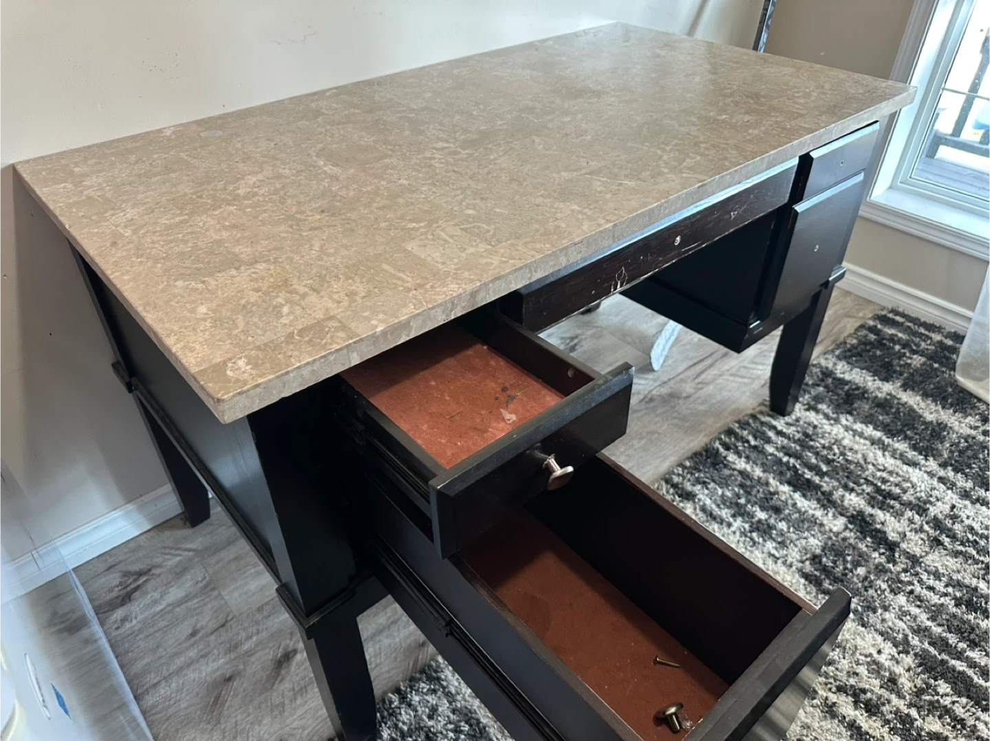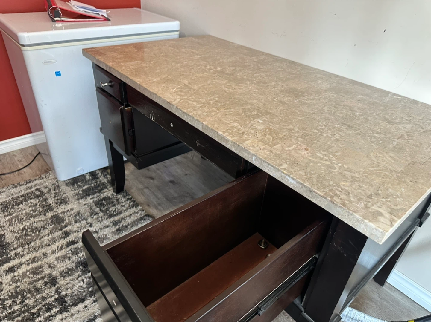 Selling a desk with a dark wood frame and a stone-like top. It features multiple drawers for storage. There are some signs of use, as pictured, but it's still a sturdy and functional piece of furniture for your home office or study space
