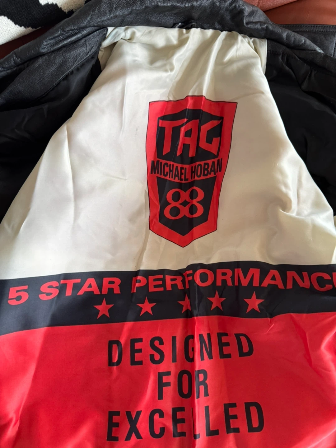 Stylish TAG leather jacket in a striking red, white, and black colour scheme! It's a real statement piece with its unique design and bold lettering. Perfect for adding a bit of edge to your wardrobe