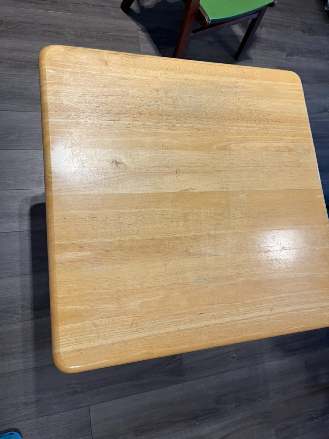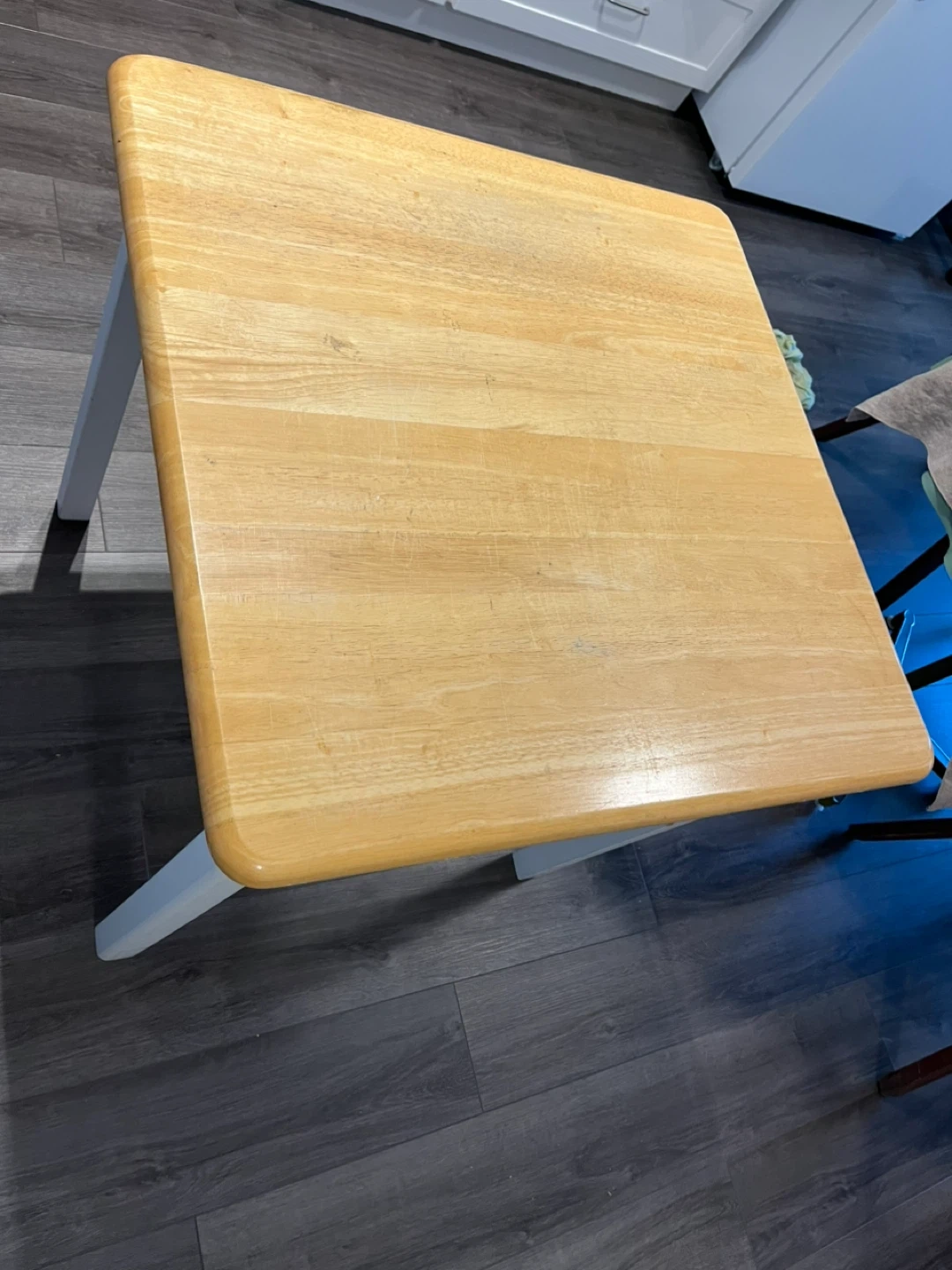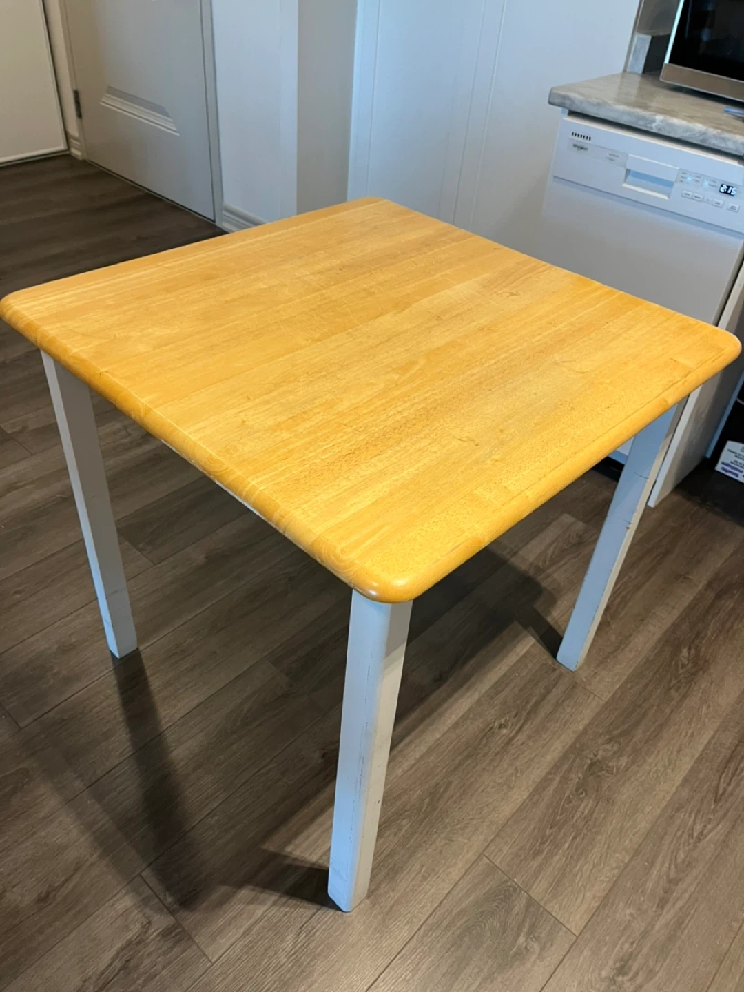 47Here's a cute little wooden table with a light wood top and white legs. It's perfect for a small space or as a side table. It is in good condition and ready for a new home!