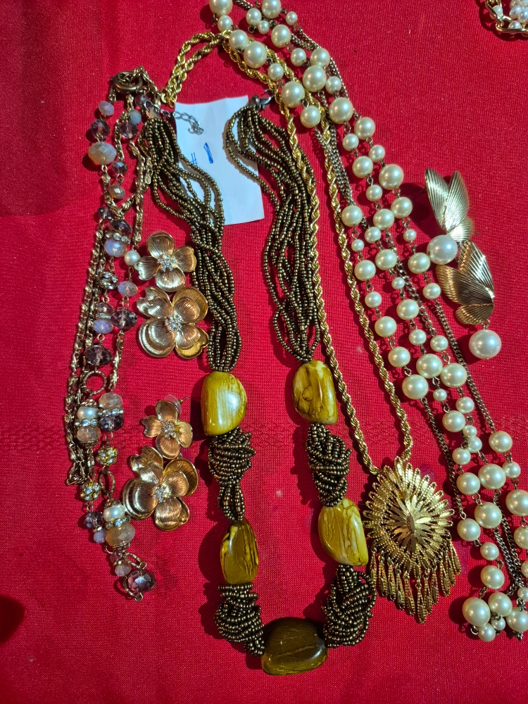 Selling a collection of vintage costume jewellery. Includes necklaces and earrings with pearls, beads, and floral designs. Perfect for adding a touch of retro style to your outfits!